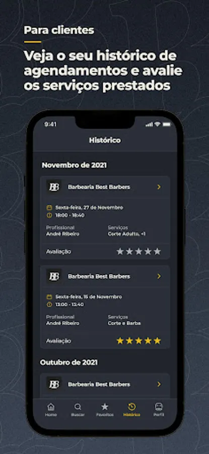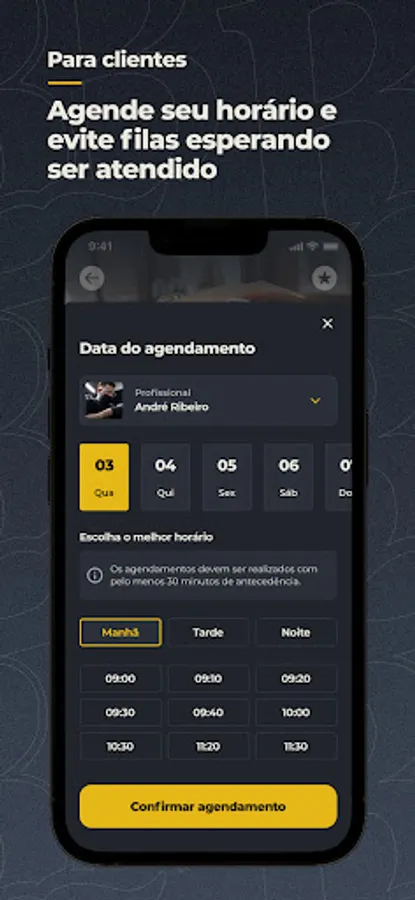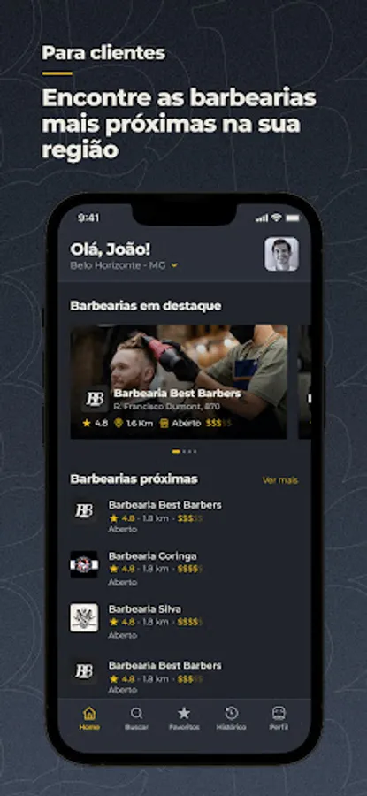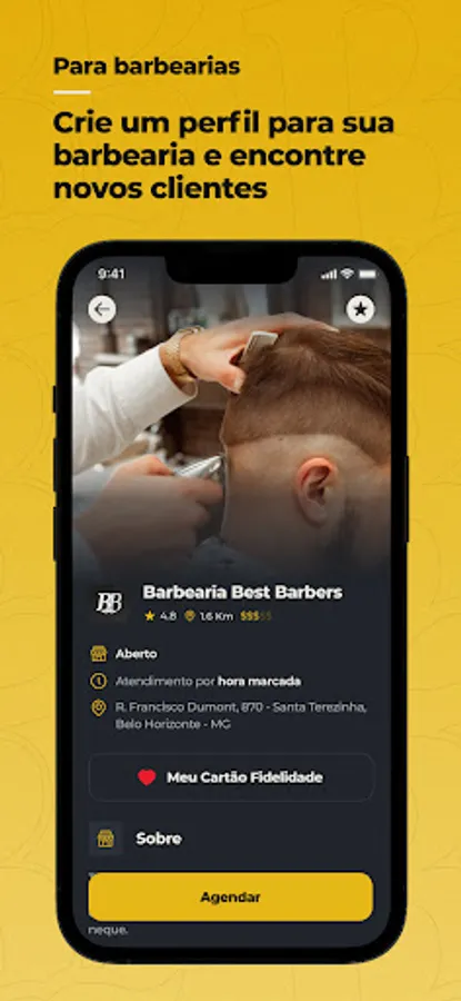 Customers can find nearby barbershops or also search by name. The barbershop's profile in the app is present so that the customer can view the establishment's space and also photos of the services and values, in addition to the opening hours.