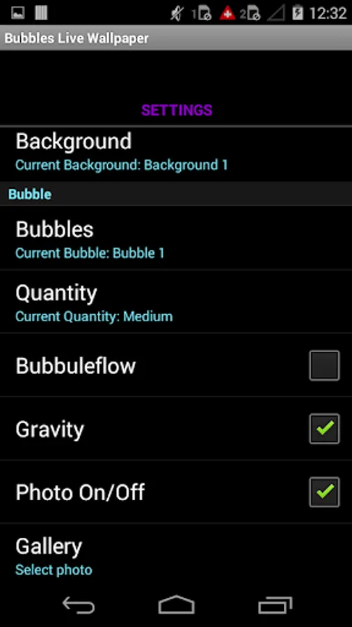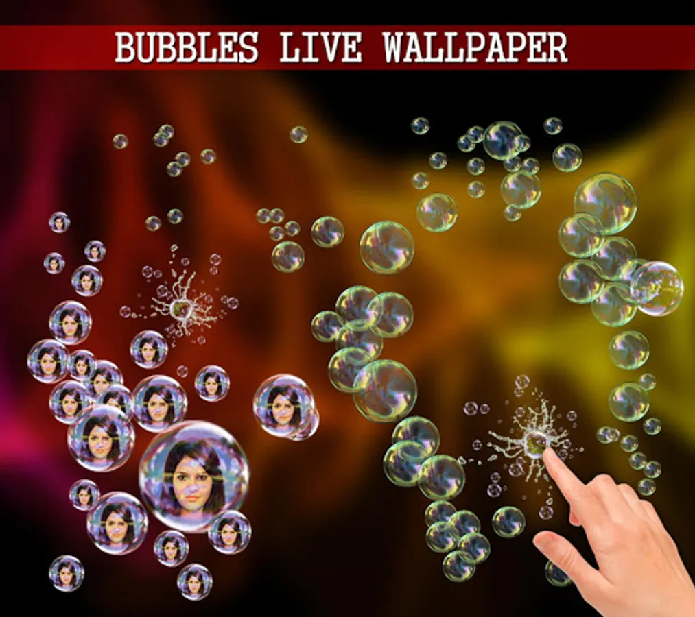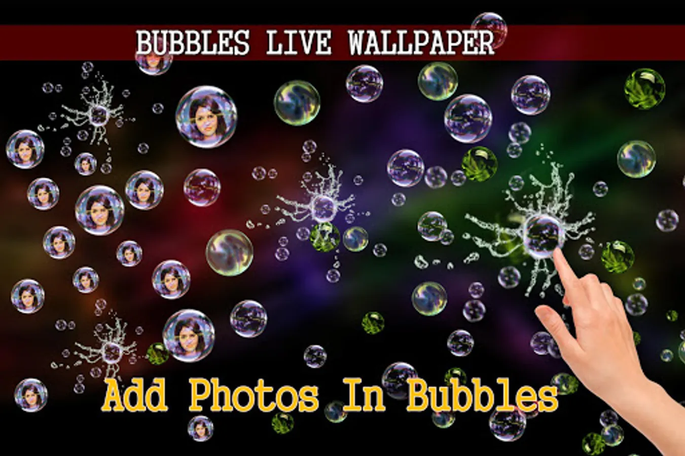 The main thing is in bubble selection you can add your beloved photos in it... So that your photos will be animate with water bubbles in the screen and burst when you touch.