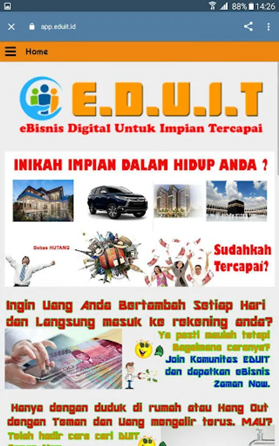 eDuit (Digital eBusiness for the Dream Achieved) is a platform where you can get money now easily and quickly only through your Smart Phone.