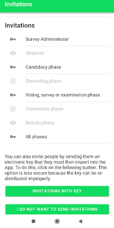 The administrator may also send invitations to participate in private surveys, in any of the phases defined above.