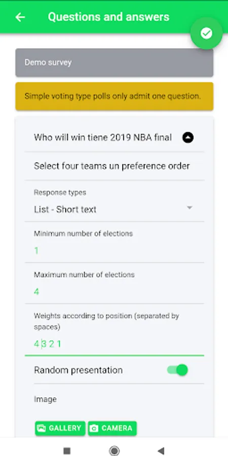 We can also indicate the type of survey, the type of question, the number of answers to be selected in each question and the weights of each of them. We can also assign images to the surveys, to the questions as well as to the answers and many other options.