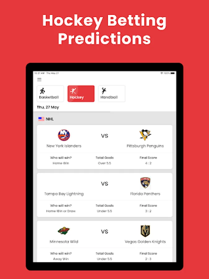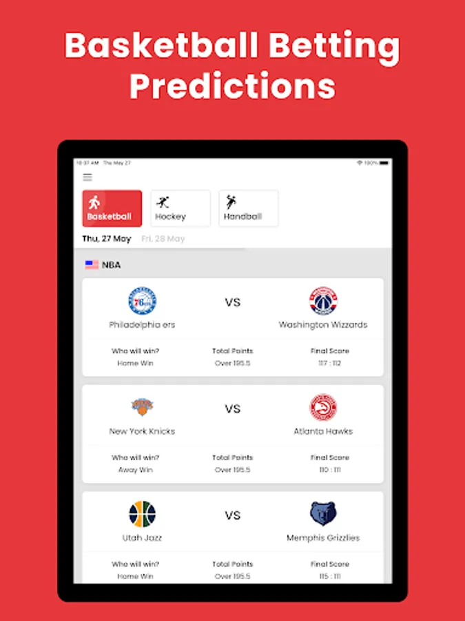 We provide professional betting predictions for basketball, ice hockey, and handball that you can take to your favorite bookmaker or bookie. Each match contains multiple betting tips such as home or away win, total points scored, and final result prediction.
