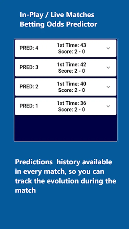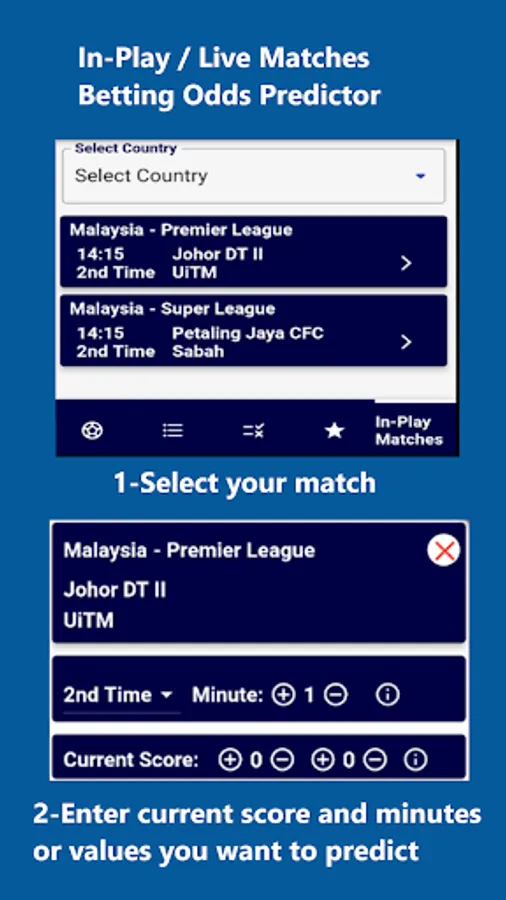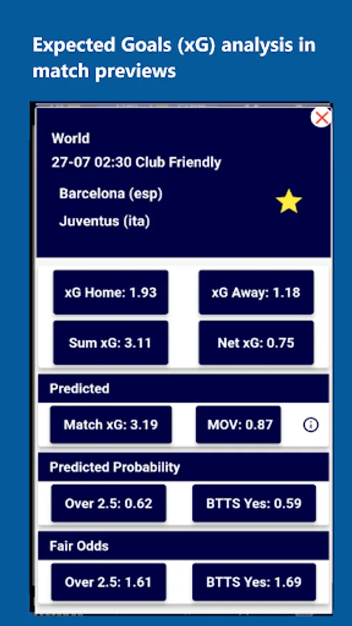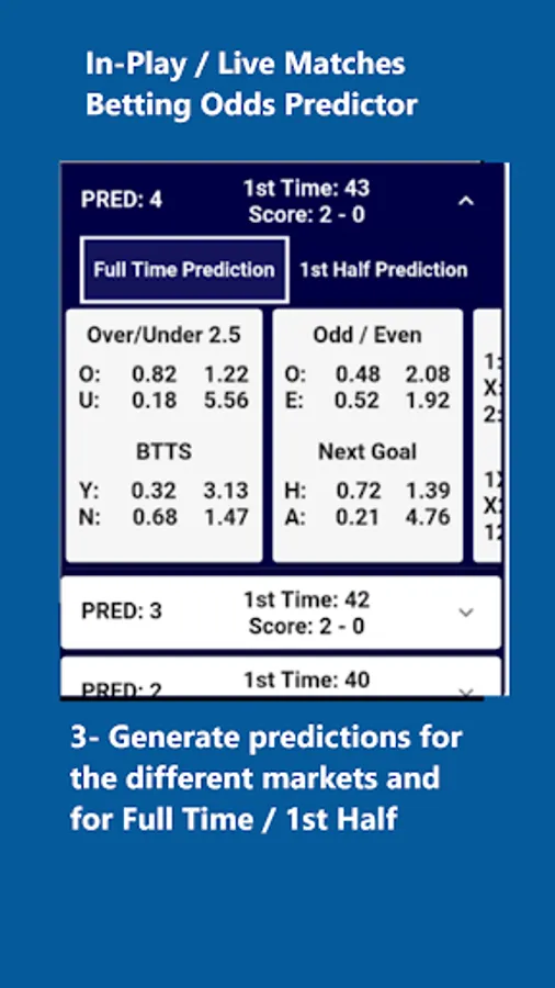 ★ In-Play / Live Betting Odds Predictor: Simply enter the current score and minutes for the selected match and it will predict probability and fair odds for the different markets supported (over/under, BTTS, odd/even, 1X2, Double Chance, Next Team to score) and for Full Time and 1st Time.