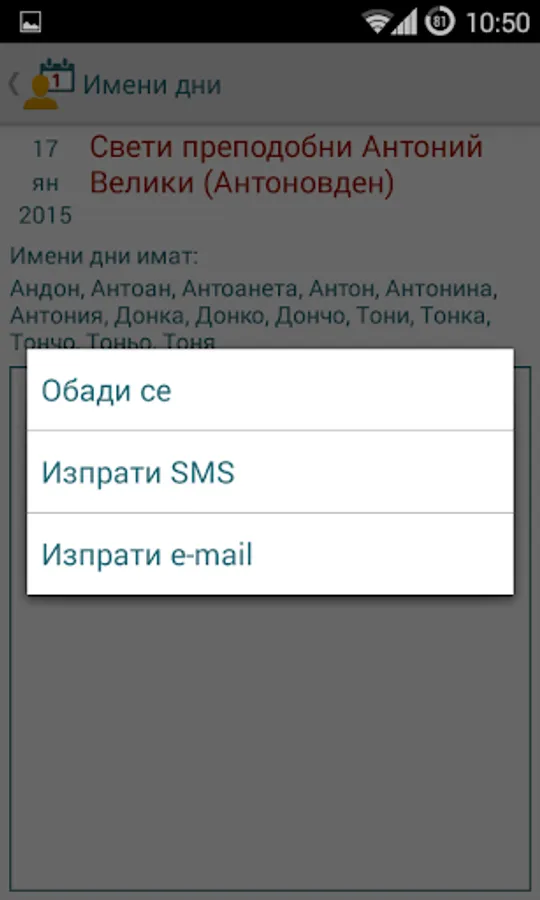 - Search imenitsi among your contacts for the holiday (possibility to call, send an SMS or e-mail)