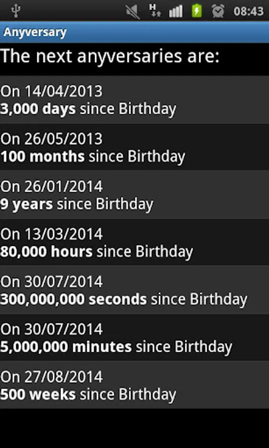 An anyversary is when a round number of seconds, minutes, hours, days, weeks, months or years have elapsed since a given event. For example, there is an anyversary on the 10,000th day since your birthday, or on the 200,000th minute since your wedding. You will be notified for these events so that you can celebrate them properly