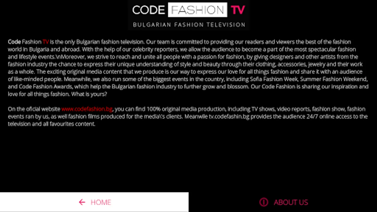 Code Fashion TV is the only Bulgarian fashion television. Our team is committed to providing our readers and viewers the best of the fashion world in Bulgaria and abroad. With the help of our celebrity reporters, we allow the audience to become a part of the most spectacular fashion and lifestyle events.
