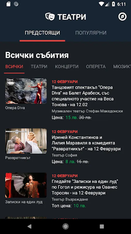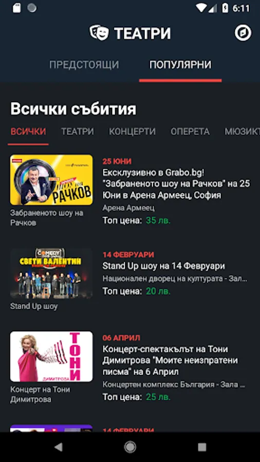 With the Theaters app, you can quickly and easily track multiple offers for theater, opera, ballet, concerts, stand-up and other events - with the ability to purchase tickets through Grabo.bg and save your seats online without going to cash desks and waiting in queues!