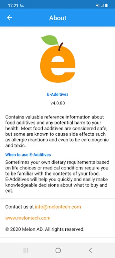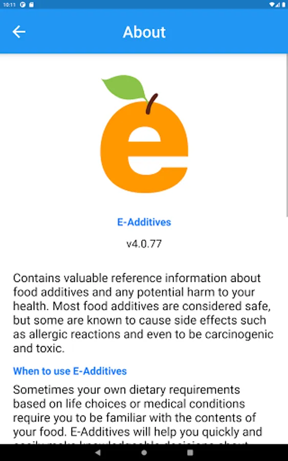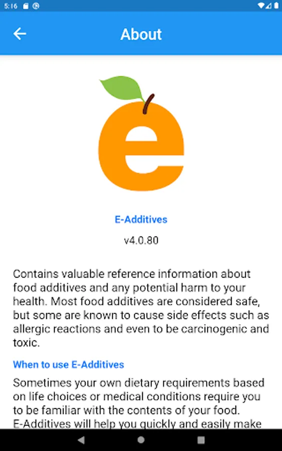 This app is only an informational database for additives. It does not provide any medical or treatment advice and may not be treated as. It may not be relied upon for the purposes of medical diagnosis or as a recommendation for medical care or treatment. The information in this app is not a substitute for professional medical advice, diagnosis or treatment. All content, including text, graphics, images and information available through this app is for general information purposes only.