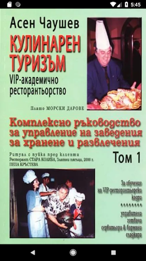 The book provides valuable information for the preparation of restaurant staff in the first section where present basic knowledge management processes restoranyorstvoto. In the second section the author has gathered topics of appetizers and main dishes, and in the third section presents the VIP-restaurants and culinary tourism, as well as guidelines for the development of culinary tourism. Here is given much space to the most famous and specific cuisines. Set out the rules and standards for VIP service at sites of culinary tourism.