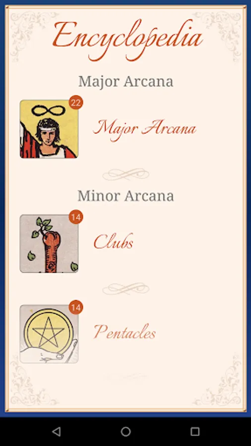 Unlike most apps, in Tarot Universe you will find a completely free detailed encyclopedia of Tarot! The encyclopedia contains detailed information and interpretations of all 78 Tarot cards, over 100 basic symbols that can be seen in the cards, which will supplement and enrich even further the information you get from each single card and spread. In addition, you have the option to check what are the most frequently seen symbols in certain cards and perform a search by symbol.