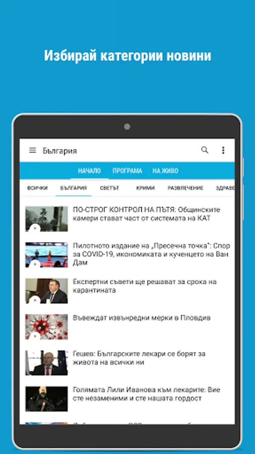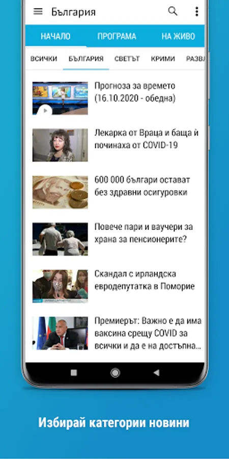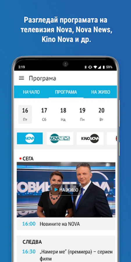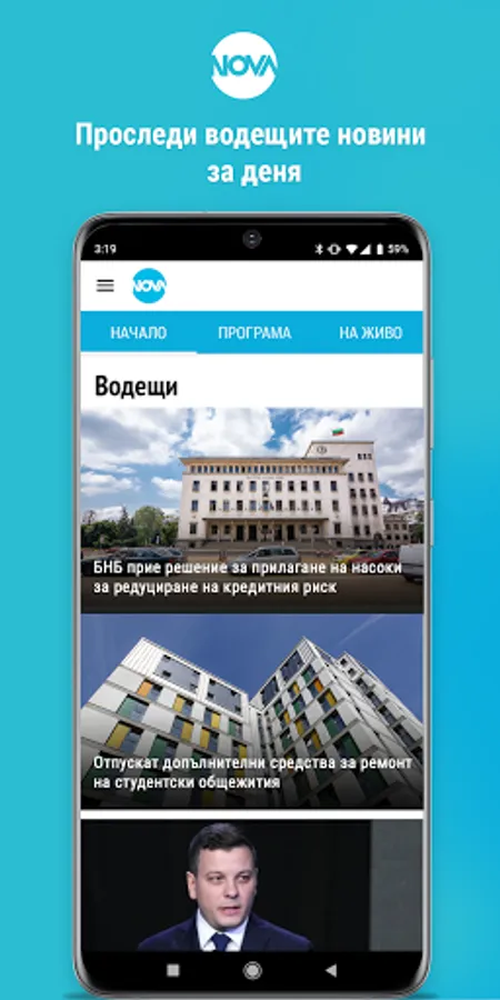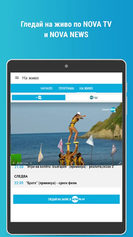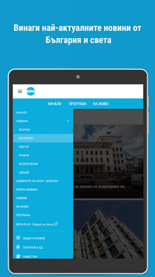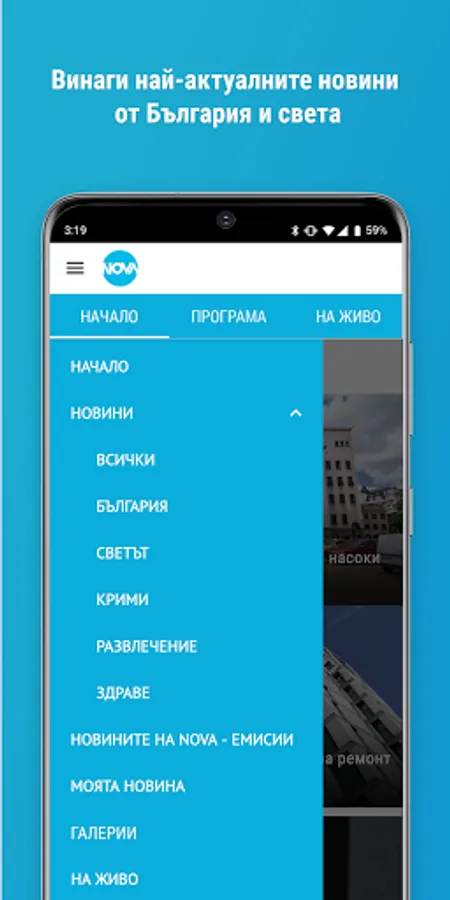 The official application of NOVA.bg offers its users quick access to the latest news from Bulgaria and the world. With the help of Push notifications, notification of the most important events of the day is just a click away. The livestream option is available in the application in the "Live" section, where you can watch your favorite shows and series in real time on your mobile device. The program of the NOVA, KINO NOVA, DIEMA, DIEMA FAMILY channels and the DIEMA XTRA sports package in EPG format is also available to users at any time.