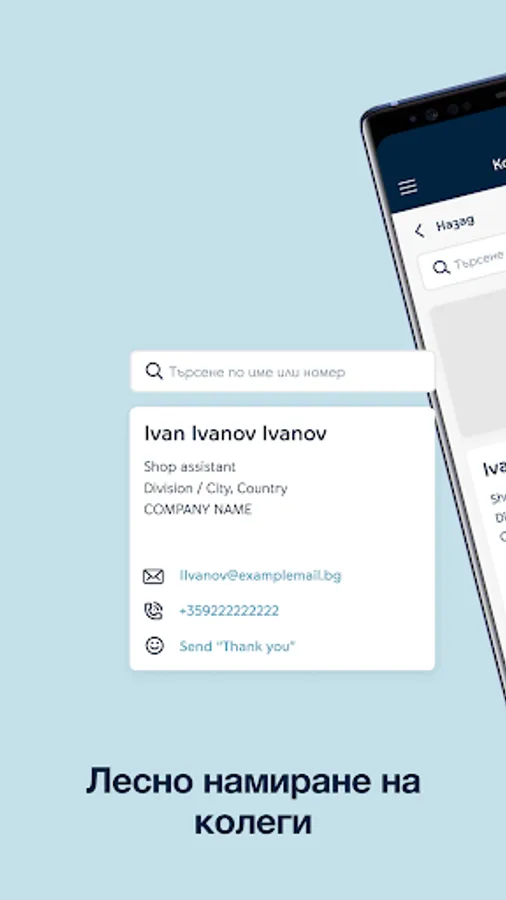 • send business contacts and your organizational structure, tap to call or send email