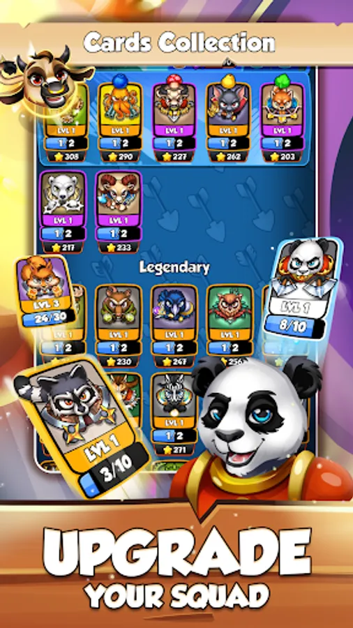Your activity is constantly rewarded and you will earn new and different cards with cute but furious animals that can be upgraded. It is completely up to you how to invest in your cards and build up your strategy. You have 5 slots in your squad and placing there the right cards will grant you many great achievements on the battlefield.