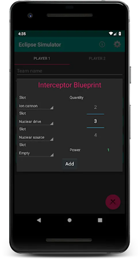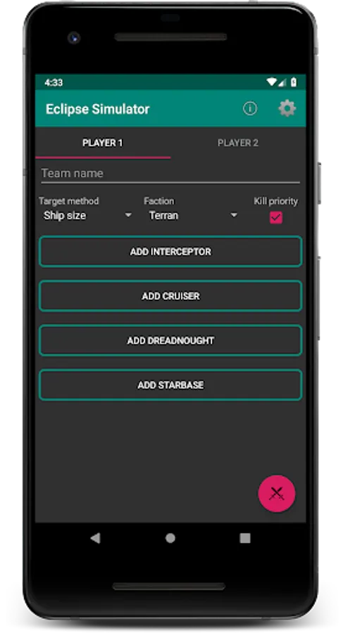 Simulates battles from the popular board game Eclipse: New Dawn for the Galaxy. The app will run simulations and display metrics based on the given ship designs, factions, and target methods chosen. Players can design the perfect fleet for any situation and enhance their board game experience. This app has no affiliation to the designers of Eclipse.