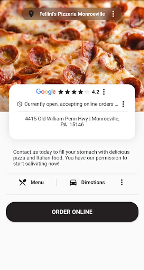 Fellini’s Pizza restaurant app has many different functions. It contains an online ordering link, restaurant images, address and driving directions, store hours, menus, and many other great features.