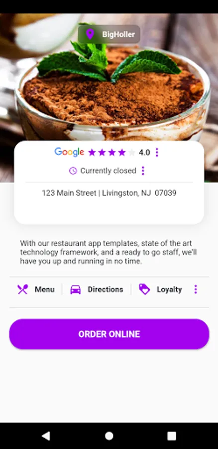BigHoller restaurant app has many different functions. It contains and online ordering link, restaurant images, address and driving directions, store hours, menus, and many other great features.
