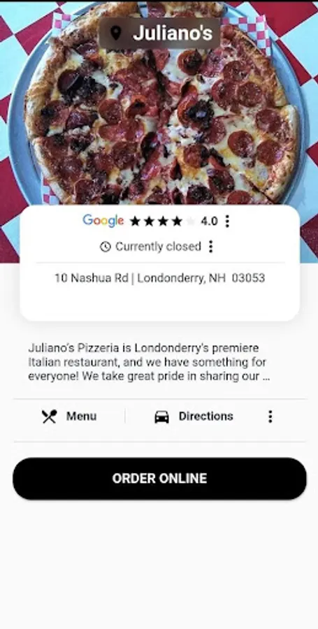 Juliano's Italian Pizzeria restaurant app has many different functions. It contains and online ordering link, restaurant images, address and driving directions, store hours, menus, and many other great features.
