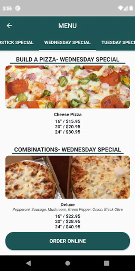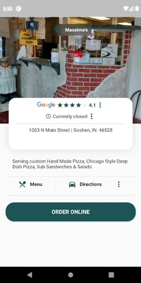 Massimo’s Pizzeria restaurant app has many different functions. It contains an online ordering link, restaurant images, address and driving directions, store hours, menus, and many other great features.