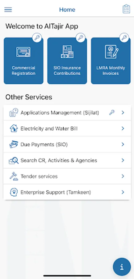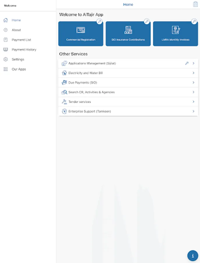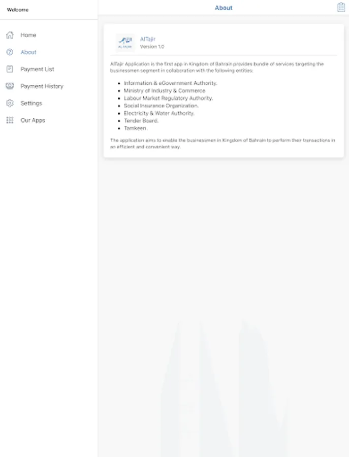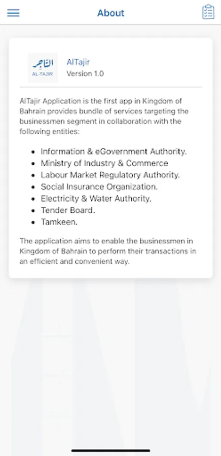 AlTajir Application is the first app in the Kingdom of Bahrain to provide a bundle of services targeting the businessmen segment in collaboration with the following entities: Information & eGovernment Authority, Ministry of Industry and commerce, Market Regulatory Authority, Social Insurance Organization, Electricity & Water Authority, Tender Board and Tamkeen. services as follows: