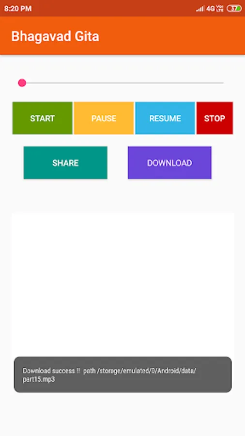 => App english version of bhagavad gita has option to download each parts as mp3 and share it to your friends and family. it will be easy to use and one click play app.