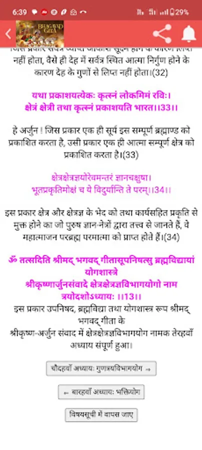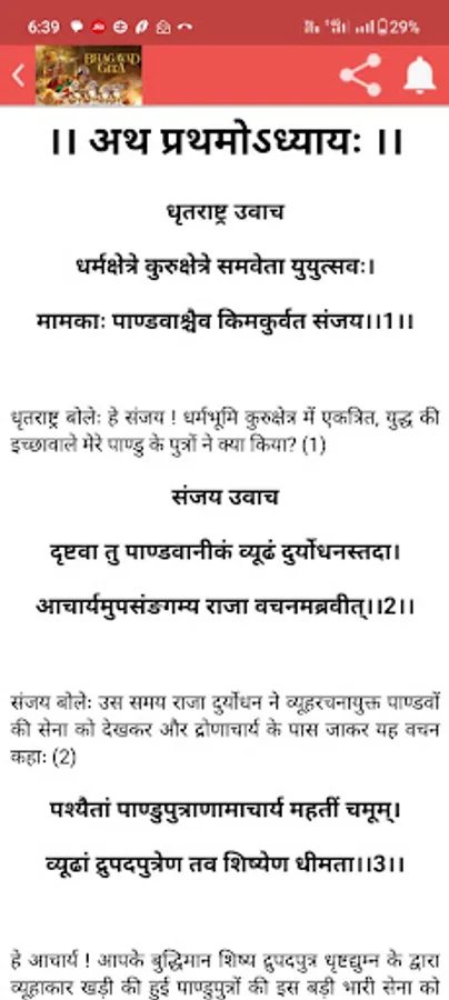 Complete Text: Access the full text of the Bhagavad Gita in its original Sanskrit language with an Hindi translation.