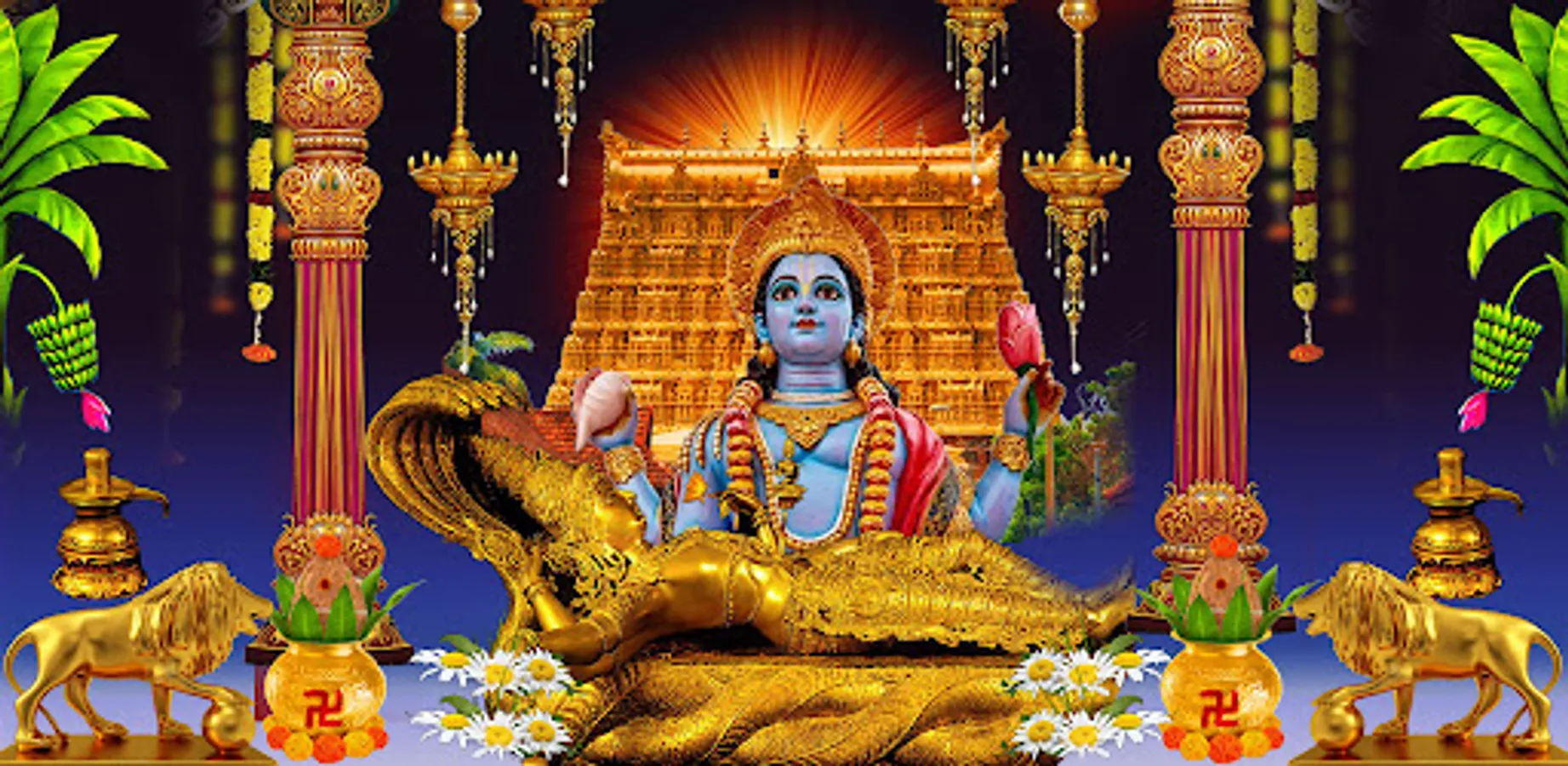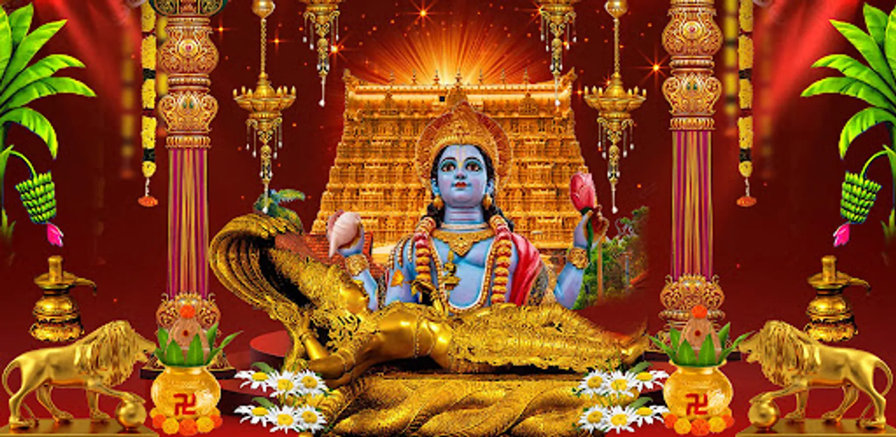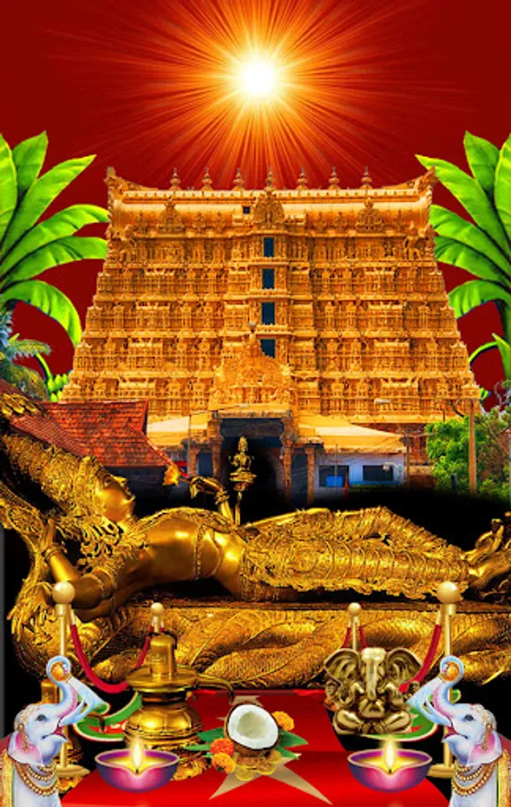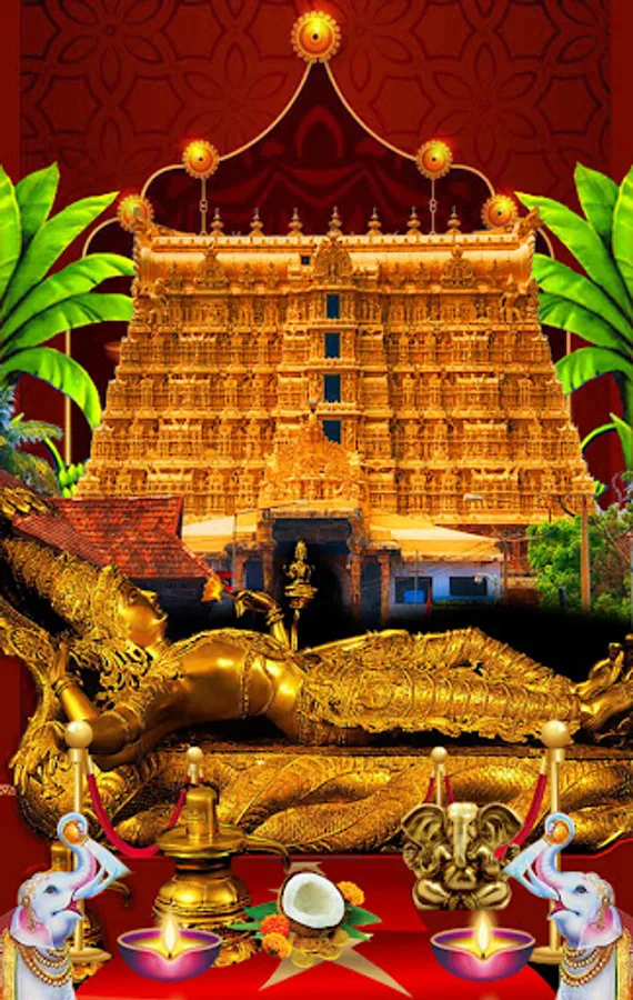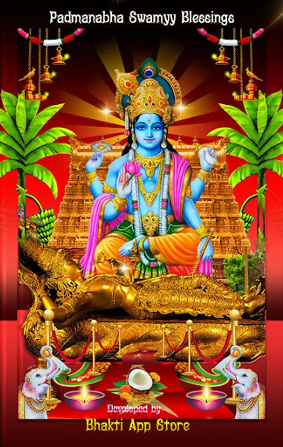 Lord Padmanabha Swamy Blessings Theme Live Wallpaper with rays animation, bells, flowers, Deepavali ( Traditional oil lamp ), Stars & leafs fall animation with magic touch & Padmanabha Swamy Temple Themes.