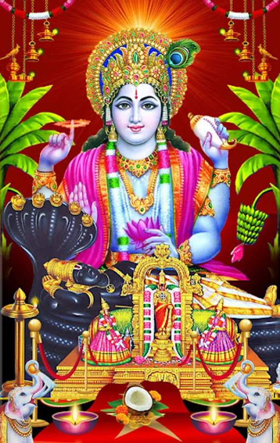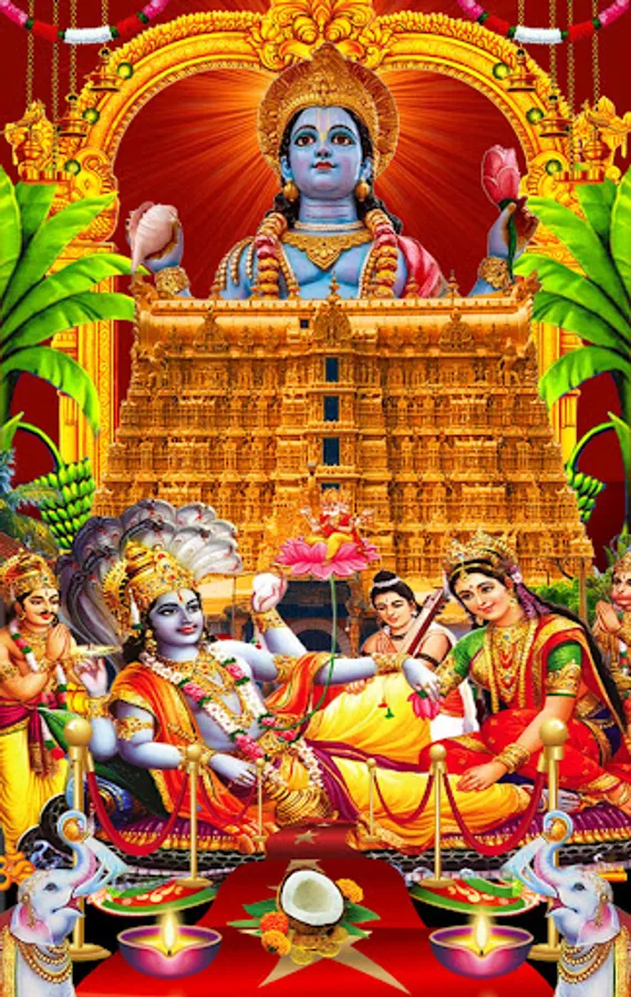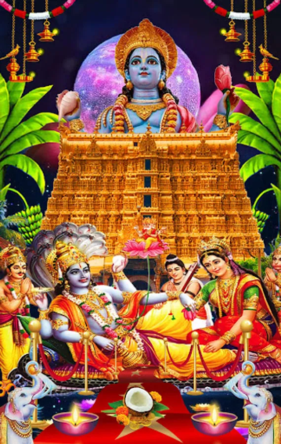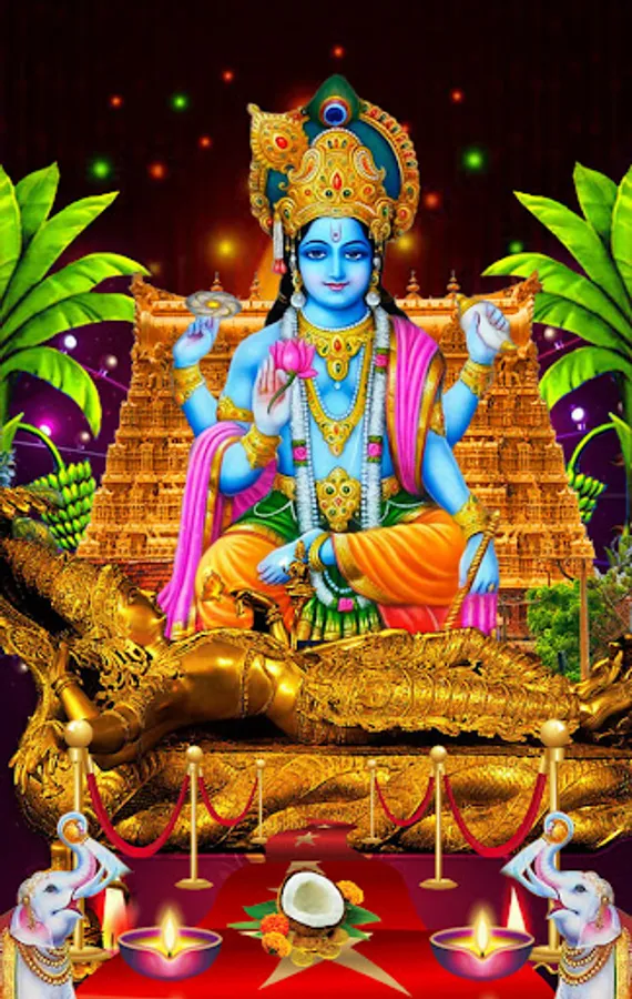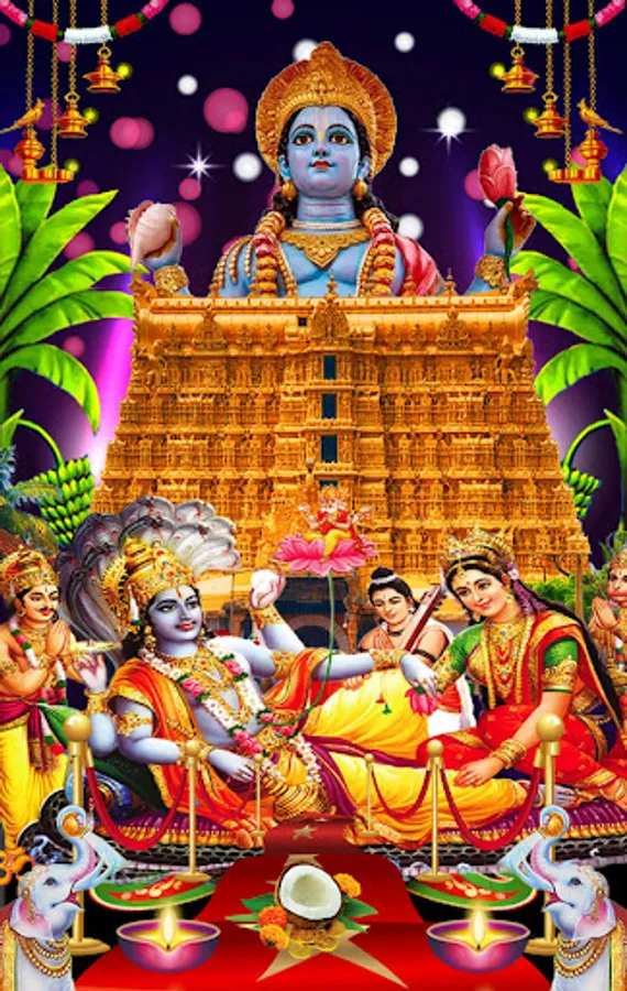 Sri Padmanabha Swamy Theme live wallpaper decorate with flowers, lamps, nature backgrounds, night lights themes. You have an option to selected backgrounds, Sri Lakshmi Narayana Swamy themes, flower fall styles & rays style.