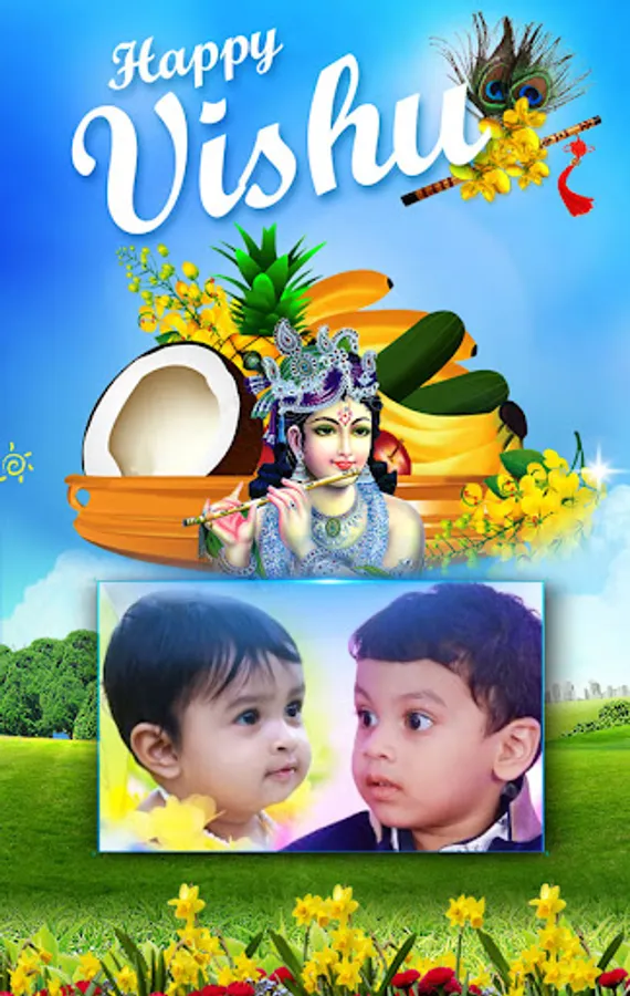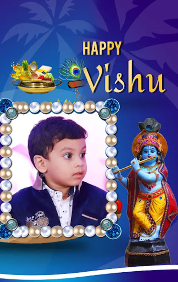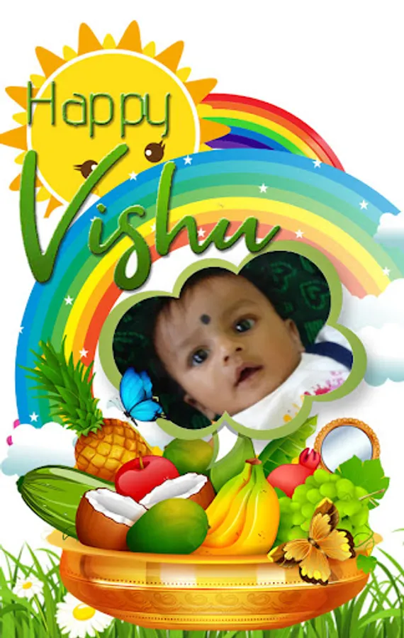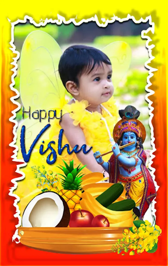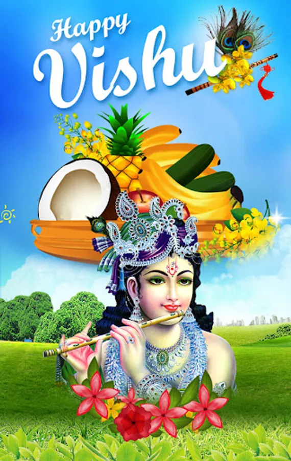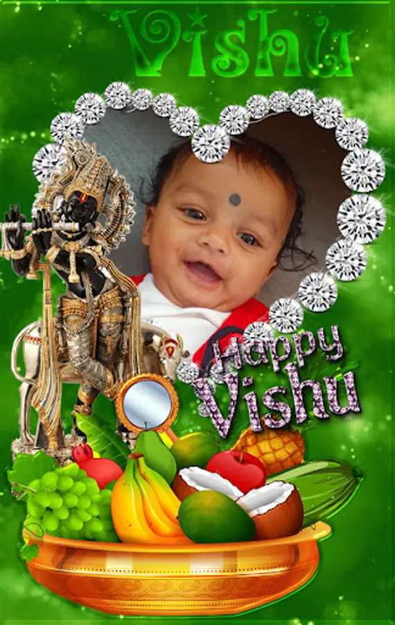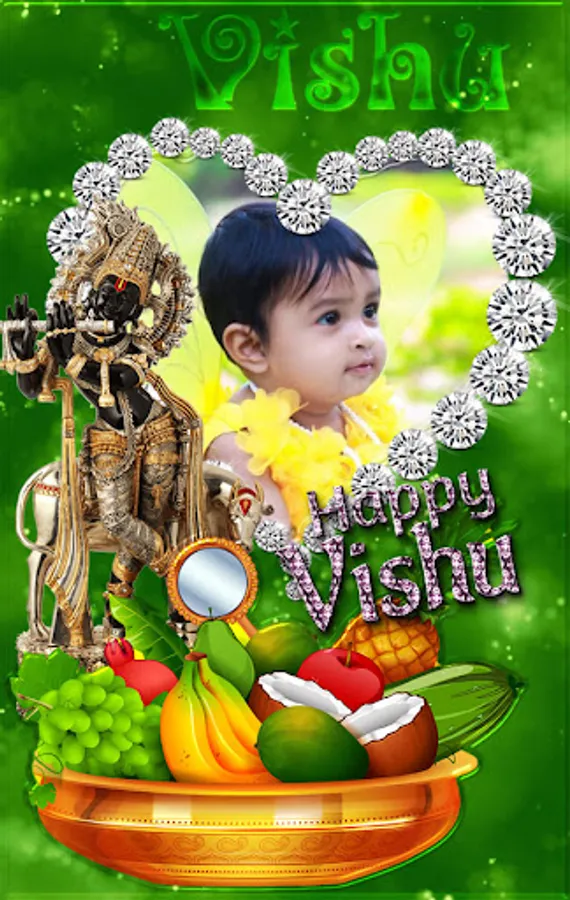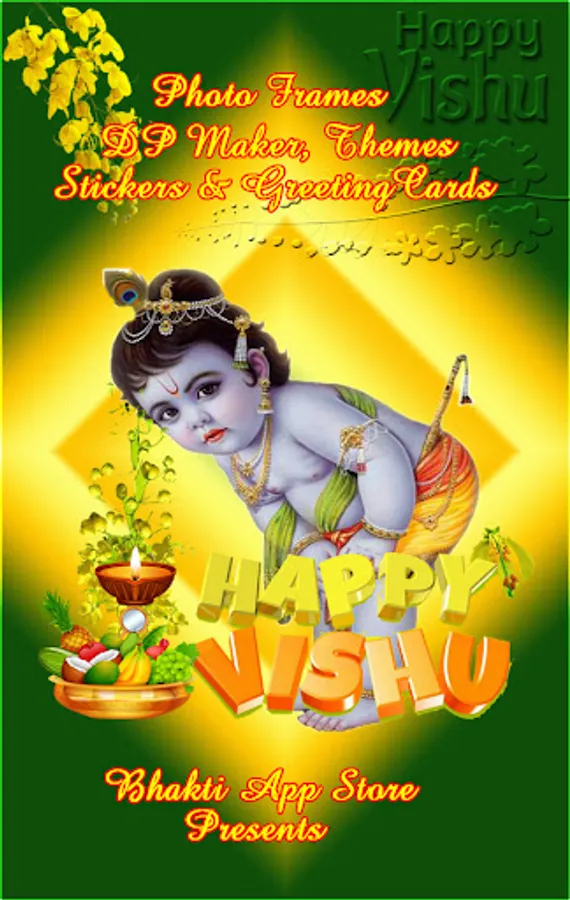 Happy Vishu Keral New Year Theme Greeting Cards, Stickers, Photo Frames, Messages & Live wallpapers. you have an option to Create & Decorate greeting cards with stickers and festival themes.