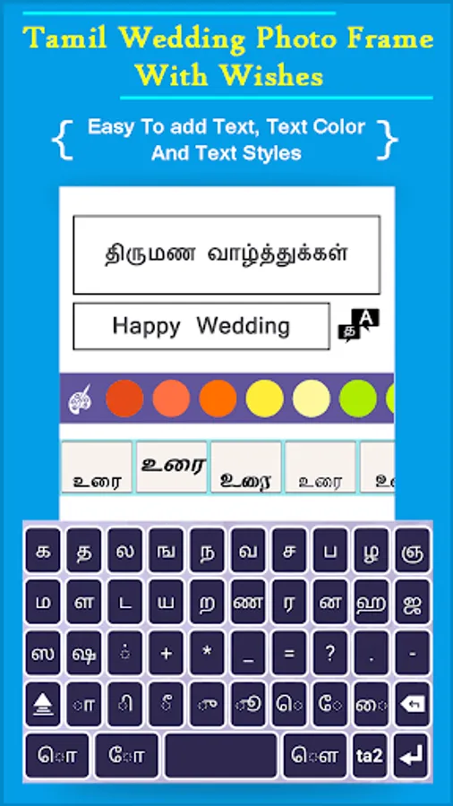 Create your wedding photos with Tamil wedding frame with wishes. write happy wedding anniversary greetings and wishes in Tamil using Tamil keybord.