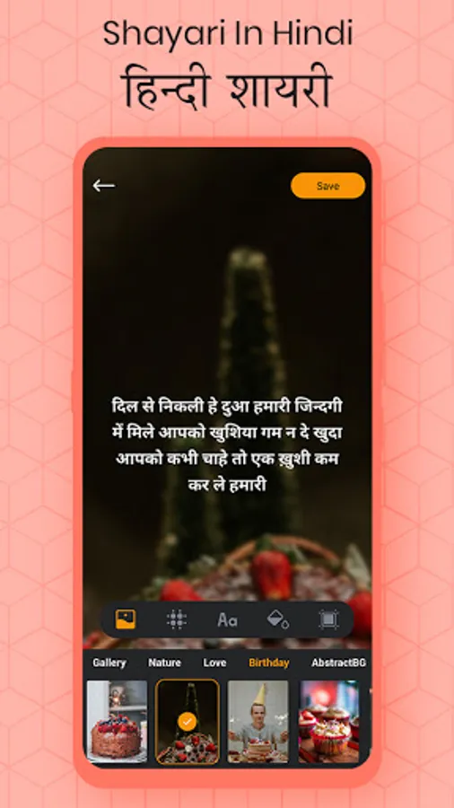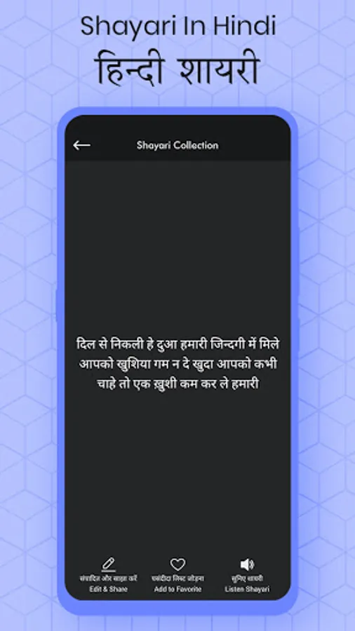 You can listen shayari from this app, just click and feel free to listen. Shayari ki Diary or Hindi Shayari app you can express your Love, Romantic Feelings, Sadness. Select your favourite shayari, edit selected shayari by changing different background, cool font styles, fonts size and font colors.