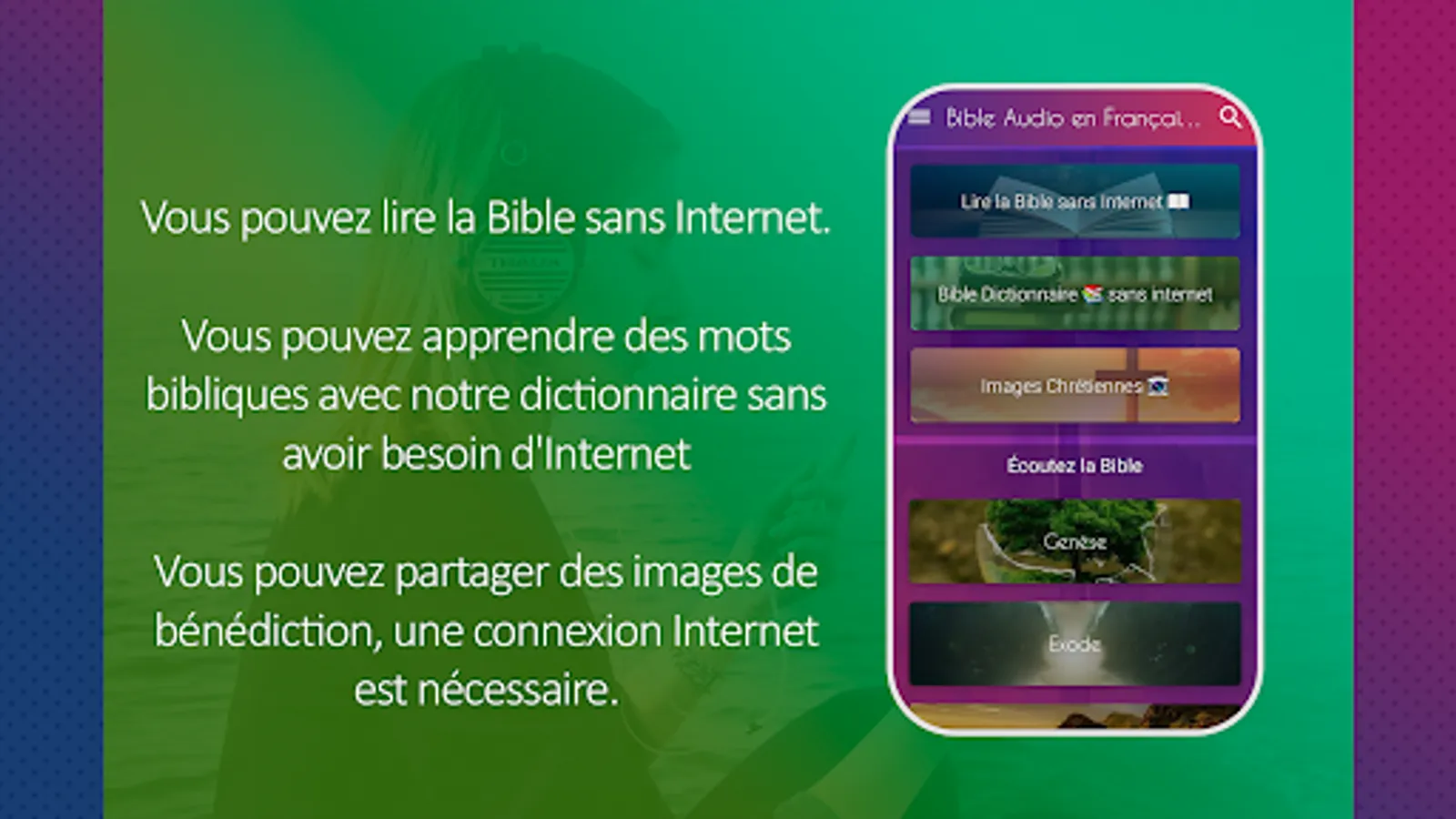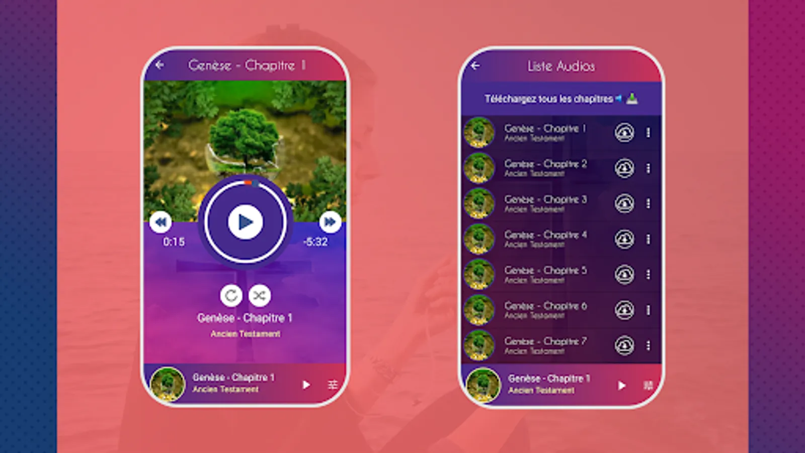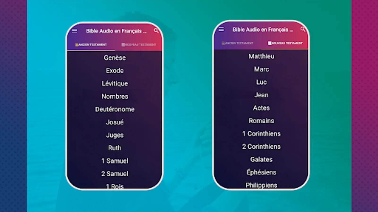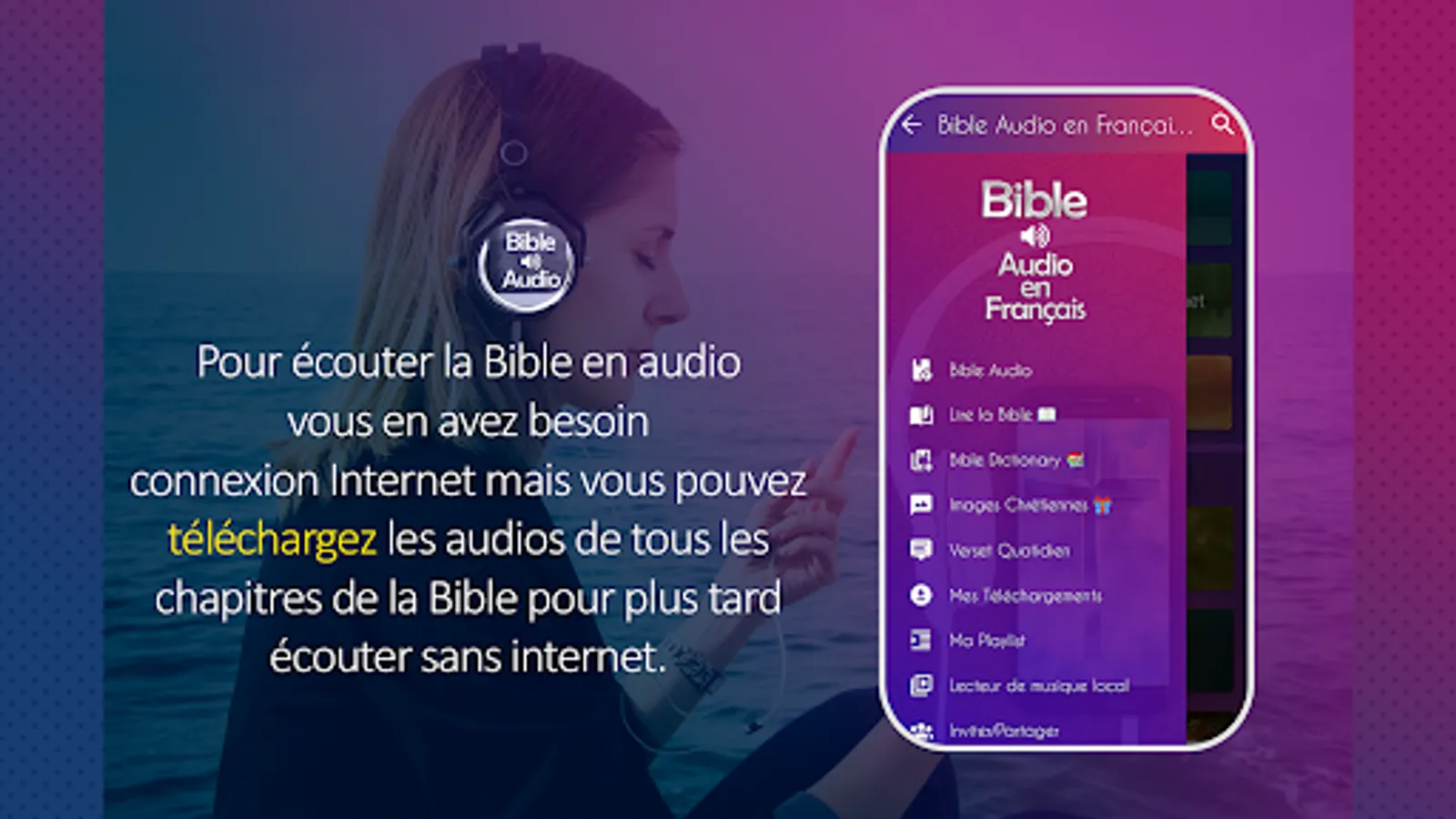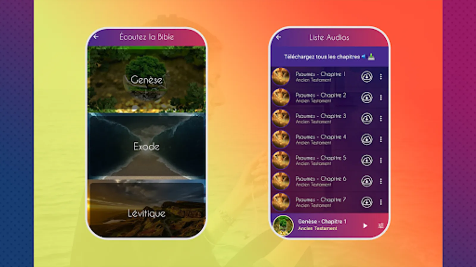 Audio Bible in French, we know that many times we come to our home after a long day at work and we aspire to read the Bible, but our strength is exhausted, it is when we act, with this Audio Bible app, you do not you will be able to relax, you will be sitting in your chair, we select the bible book you want to hear and voila, just close your eyes and listen to this beautiful and wonderful word of God that it has for you.