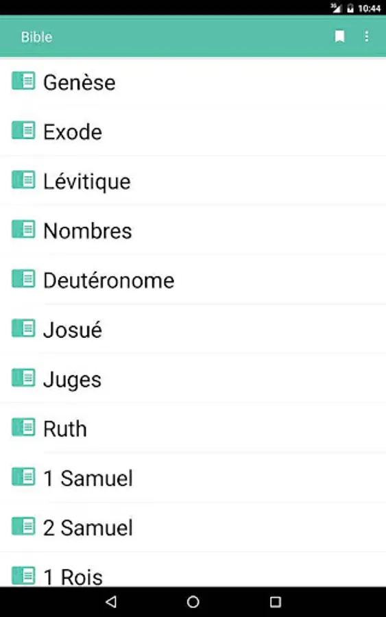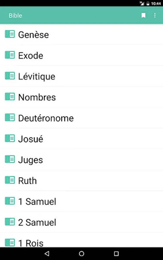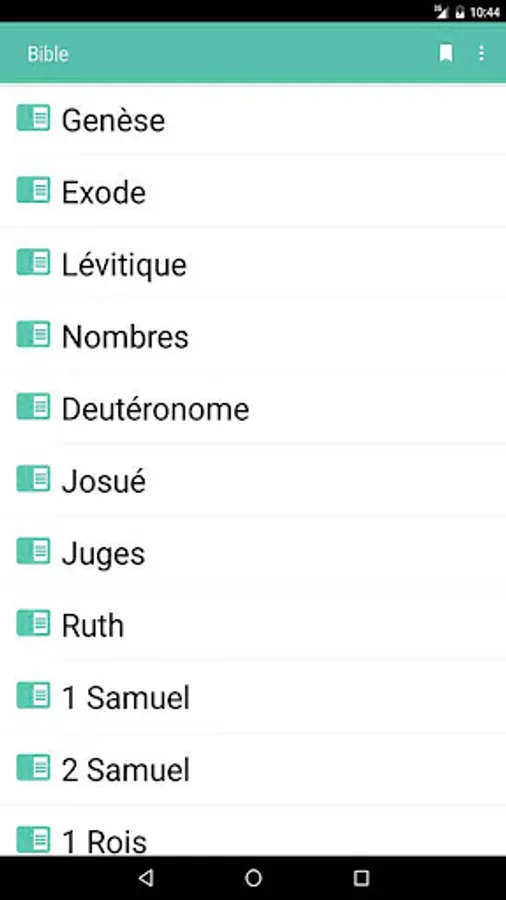New Testament: Matthew, Mark, Luke, John, Acts, Romans, 1 Corinthians, 2 Corinthians, Galatians, Ephesians, Philippians, Colossians, 1 Thessalonians, 2 Thessalonians, 1 Timothy, 2 Timothy, Titus, Philemon, Hebrews, Jacques, 1 Peter, 2 Peter, 1 John, 2 John, 3 John, Jude, Apocalypse