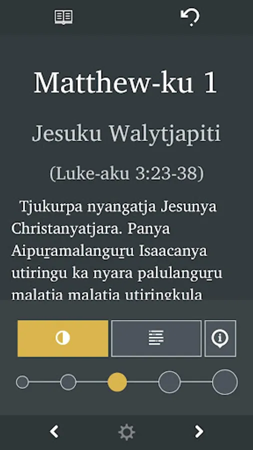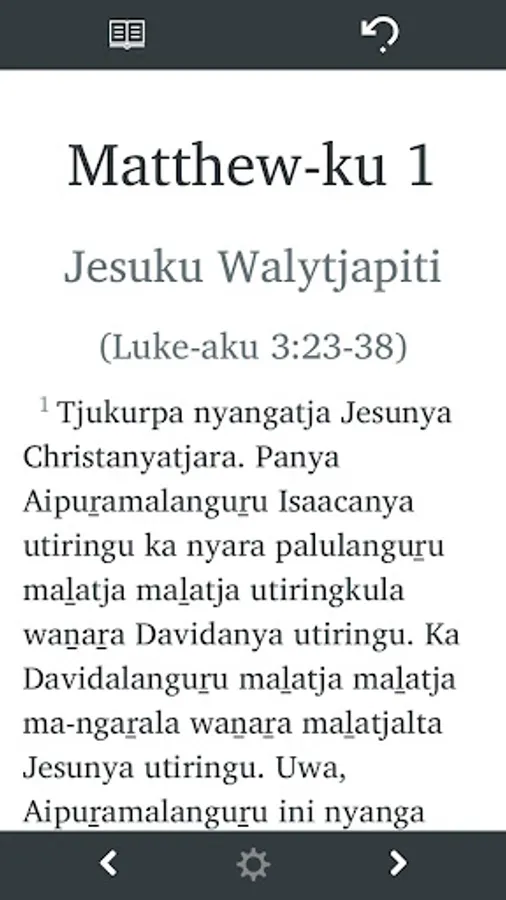 This Bible Reader app contains the Pitjantjatjara Bible – Tjukurpa Palya. Having it on your phone or tablet means you can have God’s Word with you to read at anytime. It contains the whole New Testament and some of the Old Testament.
