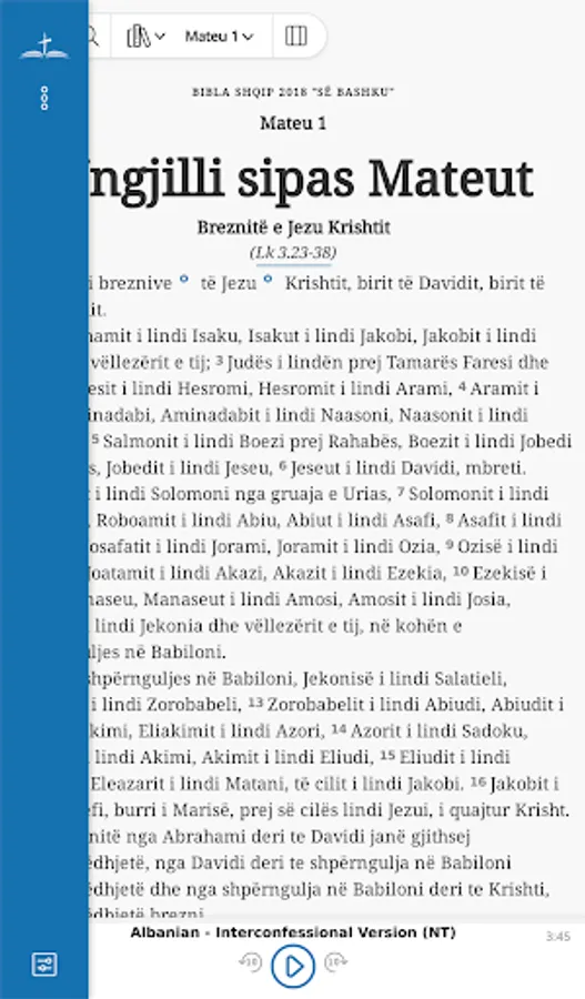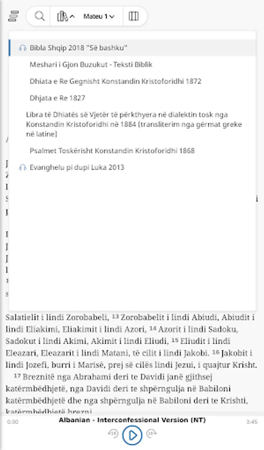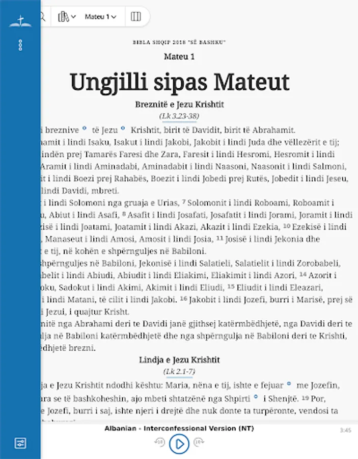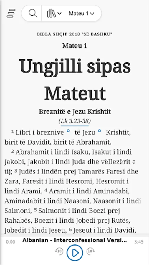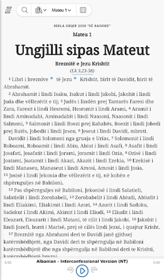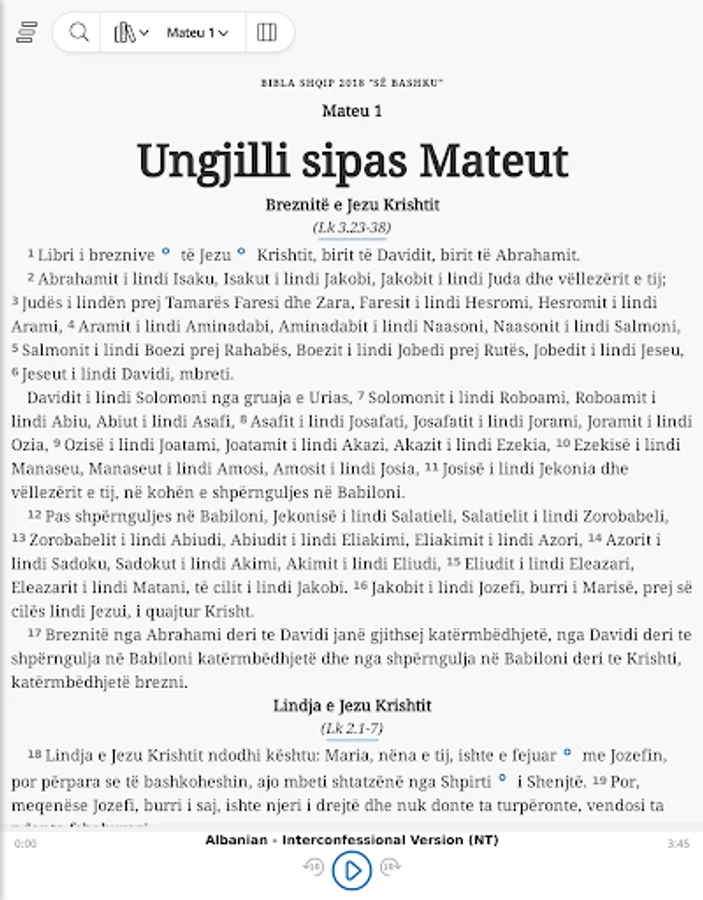 “Bibla Shqip” është një aplikacion i krijuar për ju nga Shoqëria Biblike Ndërkonfesionale e Shqipërisë në bashkëpunim me Shoqërinë Biblike Amerikane. Përmes këtij aplikacioni do të keni mundësinë të lexoni Biblën në çdo çast përmes telefonit tuaj. Një mënyrë e shpejtë dhe shumë e thjeshtë për të lexuar nga Fjala e Zotit edhe kur jeni të palidhur me internetin. “Bibla Shqip” përveç përkthimit në shqipen e sotme, ndërkonfesional, “Së bashku” përmban disa nga përkthimet më të vjetra dhe të vyera nga teksti biblik në shqip si përkthimi i Gjon Buzukut, Konstandin Kristoforidhit dhe Vangjel Meksit & Grigor Gjirokastrit. Kështu ky aplikacion nuk është vetëm një mjet i jashtëzakonshëm për të lexuar Biblën, por edhe një ndër të paktat mjete të vlefshme për studiuesit për të parë dhe krahasuar zhvillimin dhe ndryshimin e gjuhës shqipe ndër shekuj.