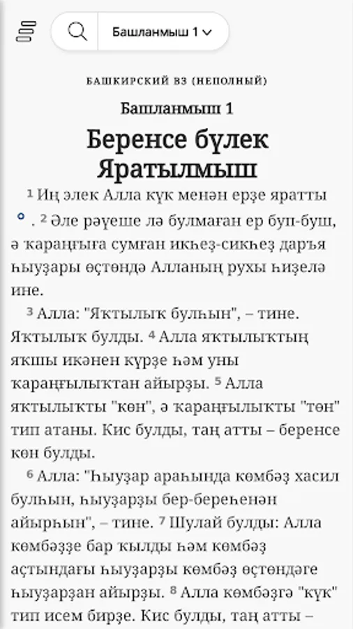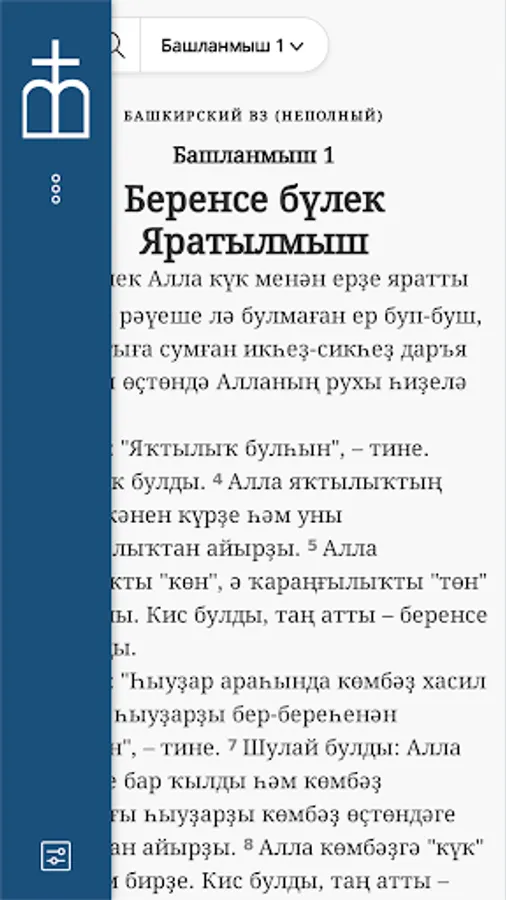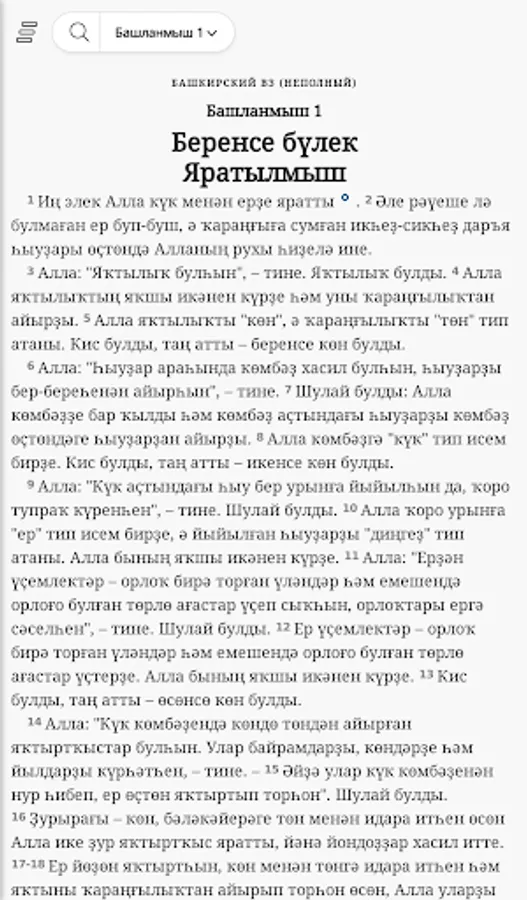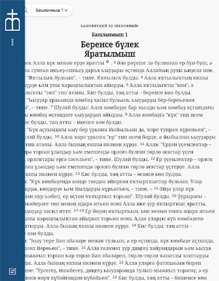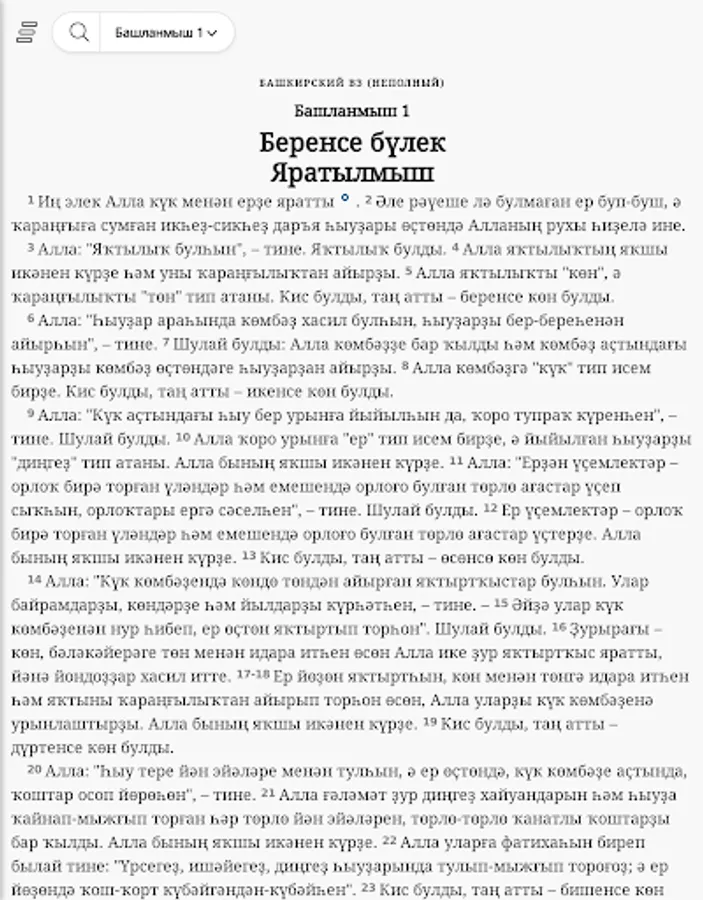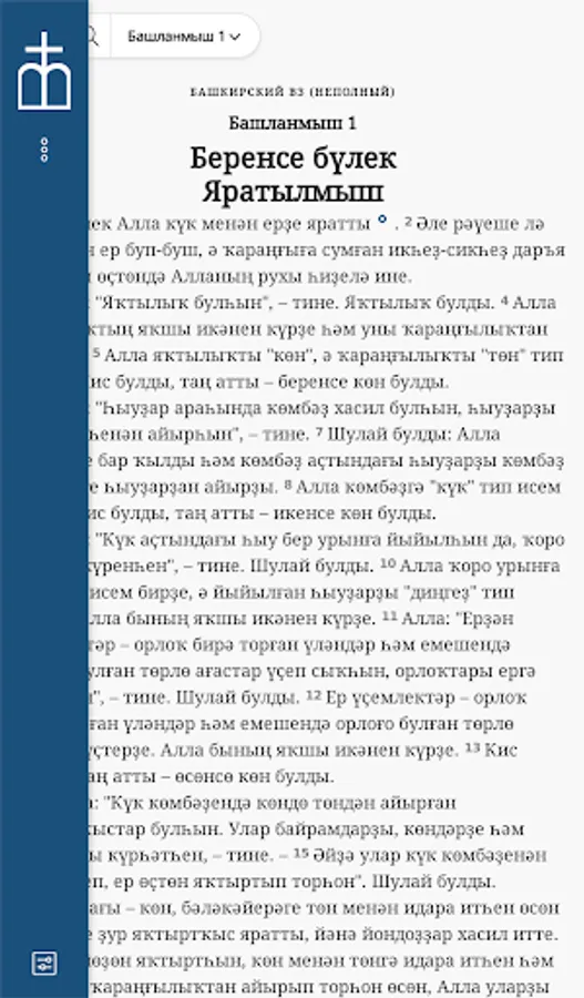 Башҡорт телендәге Изге Яҙма китаптары - һәр ваҡыт һеҙҙең янығыҙҙа булған Алла һүҙе. Алла Һүҙенә иғтибарығыҙҙы тупларға бер нимә лә ҡамасауламаһын өсөн, ҡушымтаны бик ныҡ ябайлаштырҙыҡ. Ҡушымтаның интерфейсы Изге Яҙма китаптары эсендә еңел генә күсеп йөрөргә һәм кәрәк урынын тиҙ табырға мөмкинлек бирә. Интернет эшләмәгәндә лә уҡыу мөмкинлеге тағы бер өҫтөнлөк булып тора.