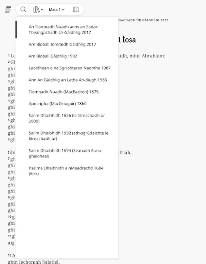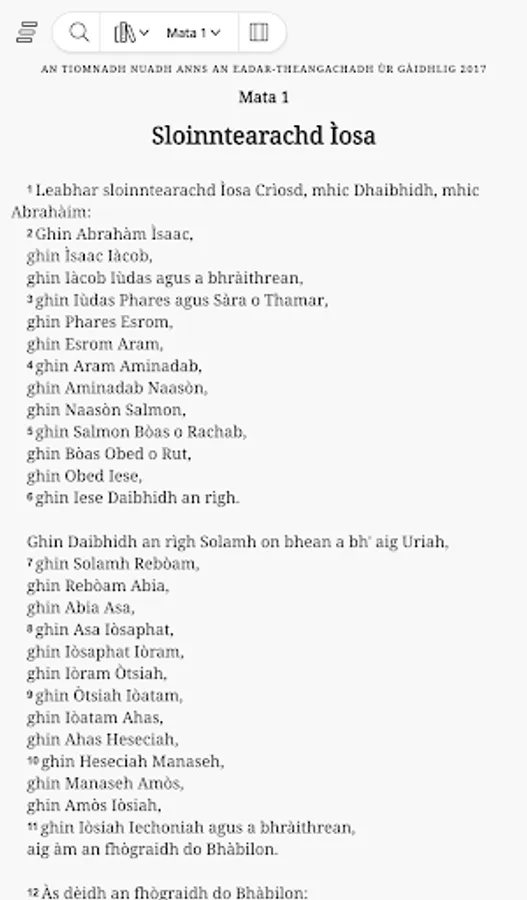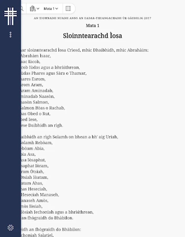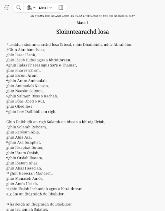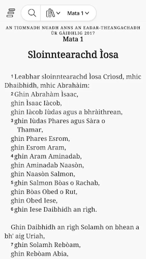 Tha e a’ tabhainn riochd leughaidh ghlain, a tha a’ leigeal dhut d’inntinn a shuidheachadh air an teacsa a-mhàin, agus a tha a’ toirt roghainn-seòlaidh sìmplidh dhut airson a bhith a’ leughadh agus a’ sgrùdadh nan Sgriobtairean.