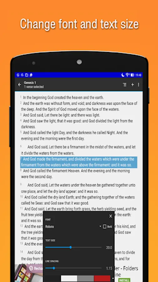 7. Font size change: Adjust the Bible text to your screen type. You can choose which size and font of the Bible text you want.