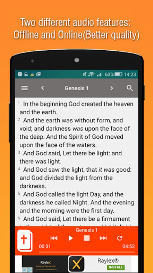 This King James Bible (FREE) version or KJV Offline has streaming audio mp3 (works offline after downloading it to your phone) or by using text to speech version". Once the mp3 audio bible is downloaded to your SD card or phone's memory, you can always listen to it without any internet. Every believer needs to download the KJV Bible.