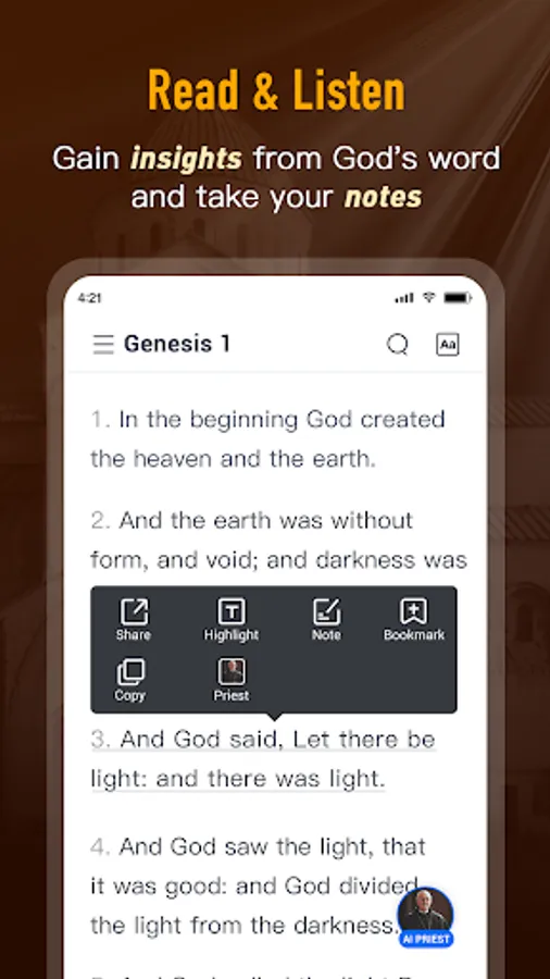 - Chat with your exclusive AI priest about anything related to the Bible.