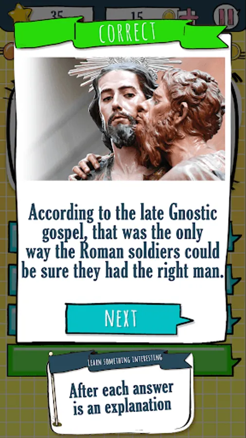 Even though you are not a particularly religious person, but you are interested in teachings of Jesus Christ, this trivia game is an excellent Bible study app with questions. Install Holy Bible Quiz Game – Old and New Testament, gain new knowledge and become a Bible expert! It's a useful educational quiz for everyone who likes challenges and learning. Start this holy book quiz and learn about the holy Bible king James version, books of Moses, Bible scholars, the Tower of Babel, sacred texts. Try this free Bible test and educate yourself about Christian religion in no time! The best part is that you can now study Bible with explanation! Guess the answer to the Bible question, wait to see if it is correct and read the pop up window which provides more information and explanation about the question and answer. You will learn everything from biblical stories and characters to biblical scriptures, verses, prayers and proverbs just by taking this Holy Bible Quiz Game – Old and New Testament!