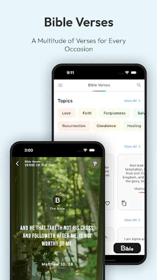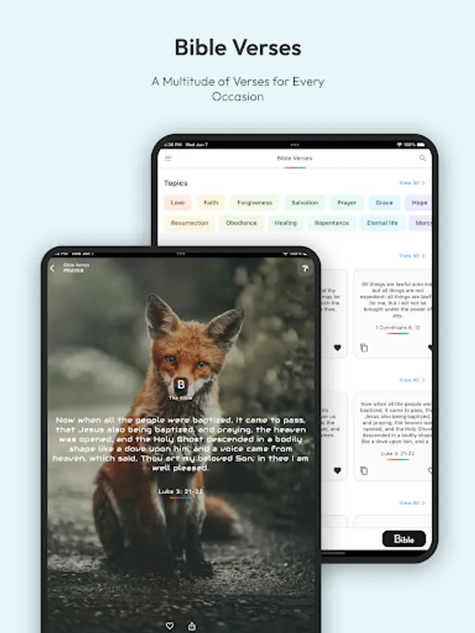 ● Bible verses: Bible verses about Love, Faith, God, Pride, Tithe, Baptism and +100 topics.