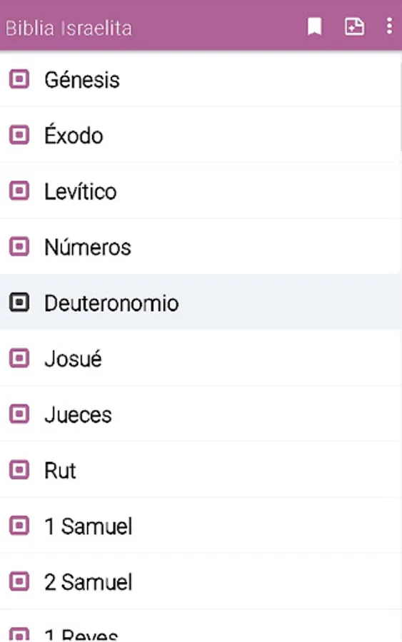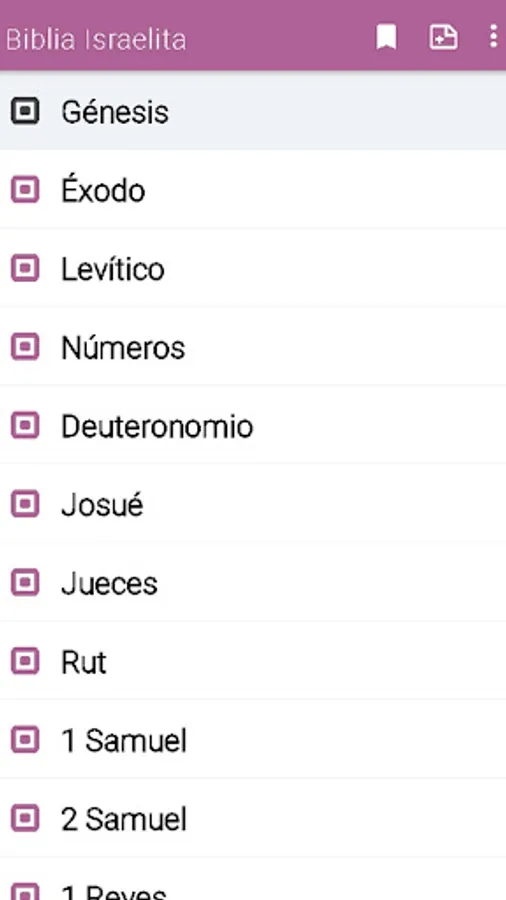 Bereshit (Genesis), Shemot (Exodus), VaYiqra (Lev), Bemidbar (Numbers) Devarim (Deuteronomy), Yehoshua (Joshua), Shofetim (judges), Ruth (Ruth), Shemu'el Alef (1 Samuel), Shemu 'Bet (2 Samuel), Melakhim Alef (1 Kings), Melakhim Bet (2 Kings), Divre Hayamim Alef (1 Chronicles), Divre HaYamim Bet (2 Chronicles), Ezra (Ezra), Nechemyah (Ne), Ester (Esther), Iyov (Job), Tehillim (Psalms), Mishle (Proverbs), Qoheleth (Ecclesiastes), Shir Hashirim (Song of Songs), Yeshayahu (Isaiah), Yirmeyahu (Jeremiah), Ekhah (Wailing), Yejezqel ( Ezequiel), Daniyel (Daniel), Hoshea (Hosea) Yoel (Joel), Amos (Amos), Ovadyah (Obadiah), Yonah (Jonah), Mikah (Micah), Nachum (Nahum), Havaquq (Habakkuk), Tzefanyah ( Zephaniah), Hagay (Haggai), Zekharyah (Zacharias), Malaakhí (Malachi), Matityahu (Matthew), Marcos (Marcos), Luke (Lucas), Johanan (John), Maaseh Shelujim (Acts), Romiyim (Rom), Qorintiyim alef (1 Cor), Qorintiyim Bet (2 Cor), Galatiy im (Gal), Efesiyim (Eph), Filipiyim (Phil), Qolasiyim (Col.), Tesalonigim Aleph (1 Thes), Tesalonigim Bet (2 Thes), Timotios Alef (1 Timothy), Timotios Bet (2 Timothy), Titos ( Tito), Philemon (Philemon), Ivrim (Hebrews), James (Santiago), Kefa Alef (1 Peter), Kefa Bet (2 Peter), Yochanan Alef (1 John) Yochanan Bet (2 John) Yochanan Gimel (3 Juan), Yehudah (Judas), Chazon Hitgalut (Revelation)