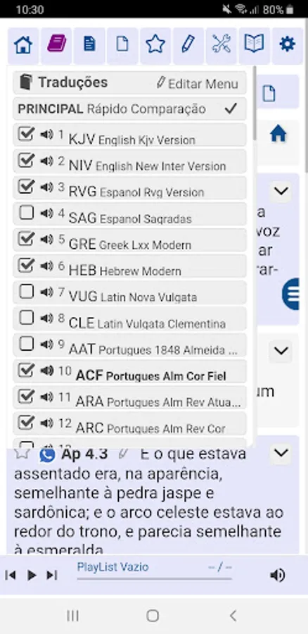 In the customizable menu you can select which translations you are going to work with and which ones you are going to compare with in order to carry out your studies. See the full list below.