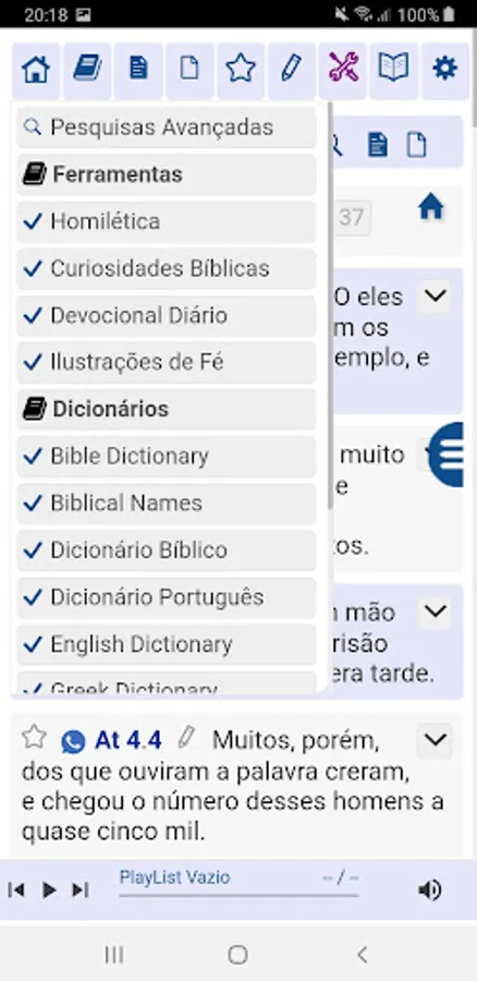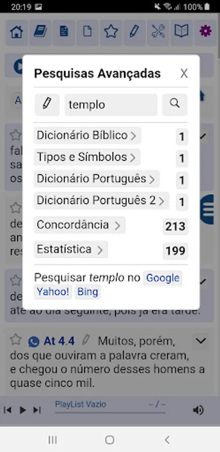 Tap on any word in the biblical text to automatically open a window with several dictionaries showing the meaning, concordance, statistics and search button of the main search engines.