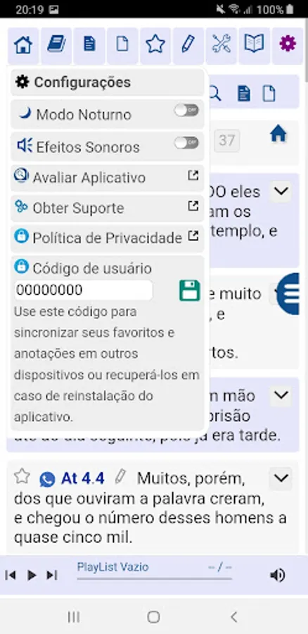 Sync your Bookmarks and Notes across multiple devices where you have installed the Ph.D. Bible. using the unique user code available in settings.