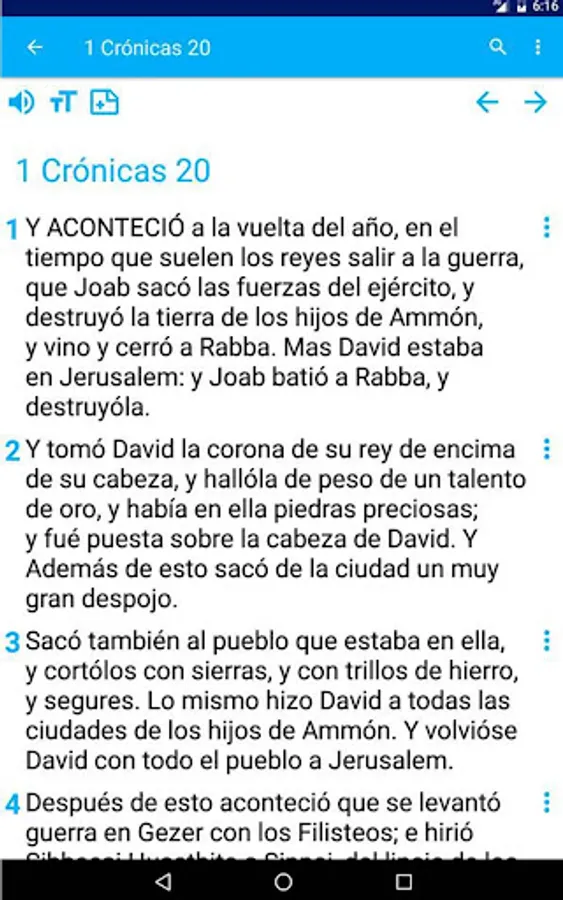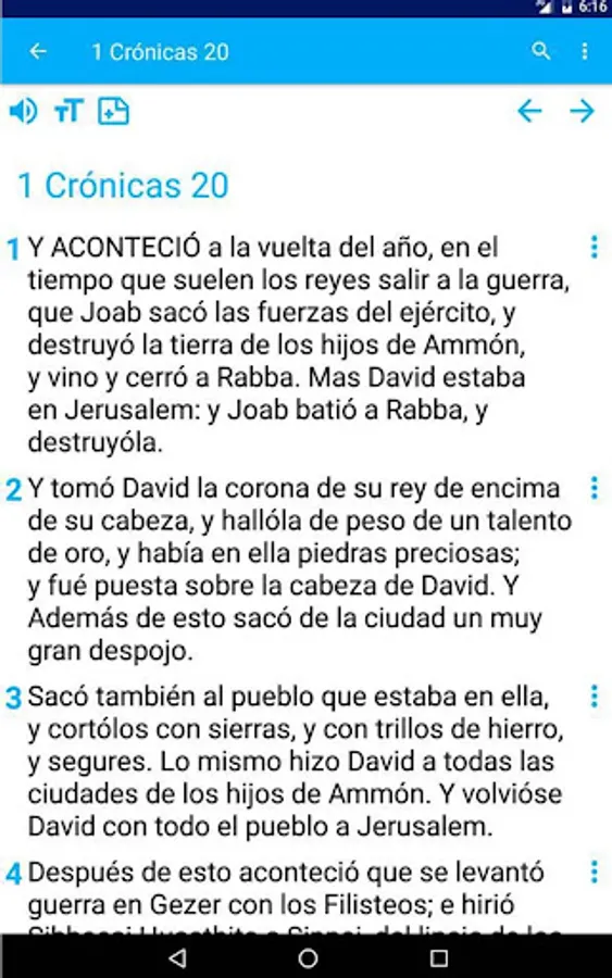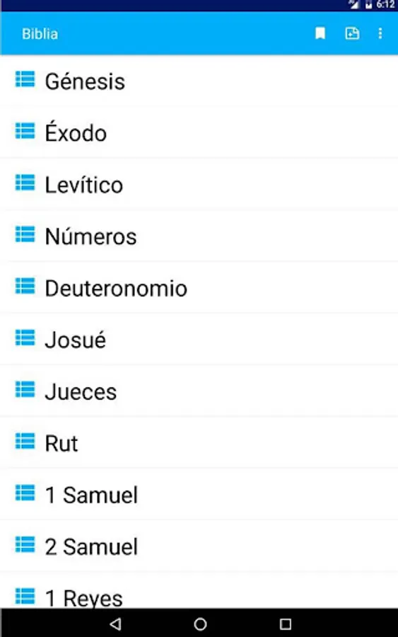 This app offers you the complete Reina Valera Bible, divided into the Old and New Testaments.