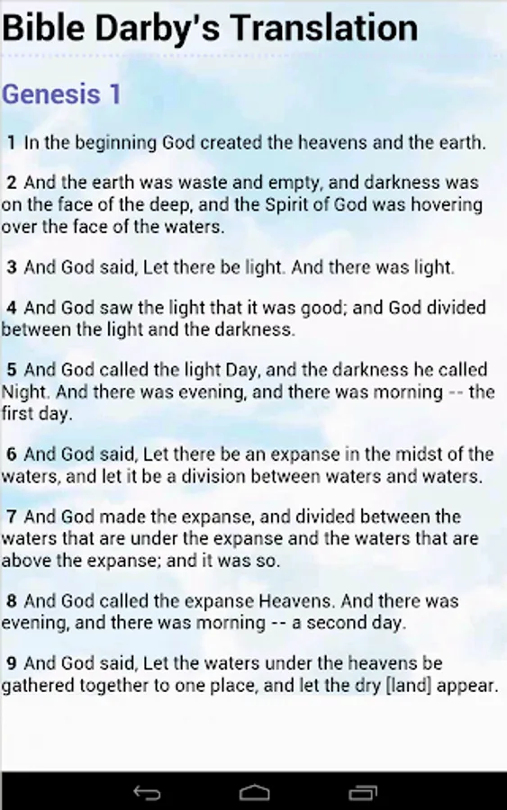 Welcome to the Holy Bible Darby's Translation Version: Includes big font for easy reading. Font size will automatically accomodate itself so it always stay big in any screen from small smartphones to big tablets.