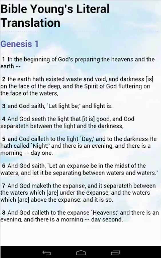 The Bible in it's Young's Literal Translation version is written in an automatic adjusting big font for easier reading: suits perfectly on any Android device screen, ranging from small smartphones to big tablets.