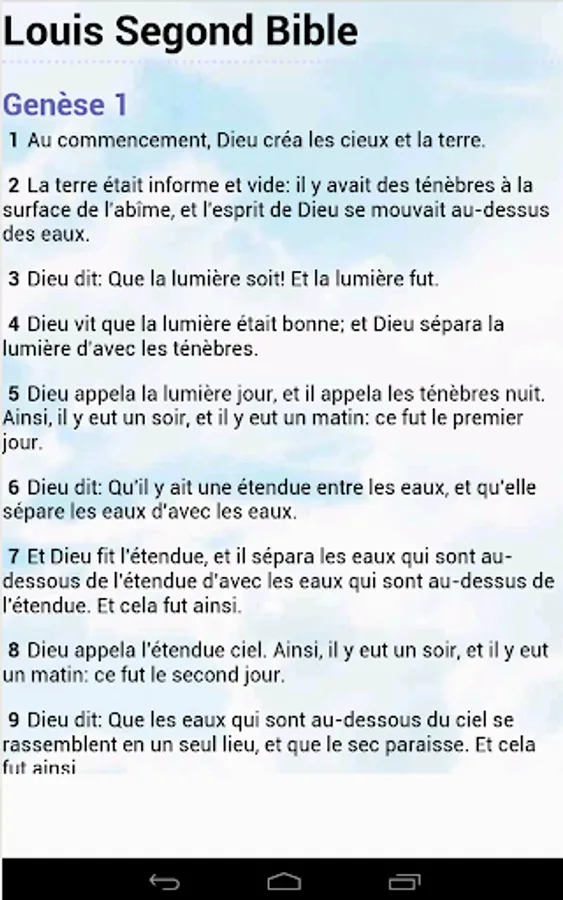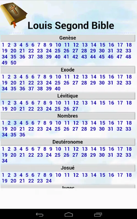 WARNING: The contents of the Bible Segond Lous comes from our site so you must have an active Internet connection so you can check the chapters.