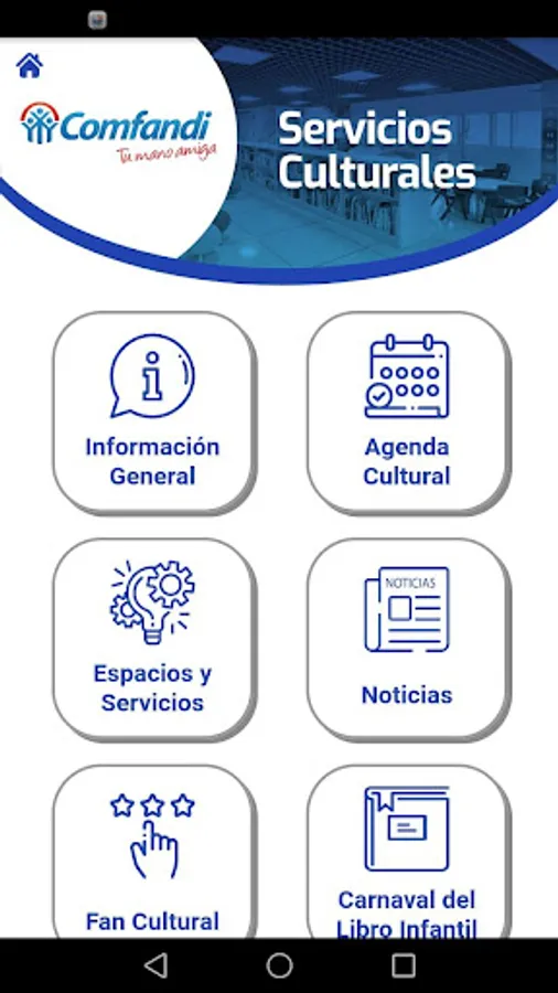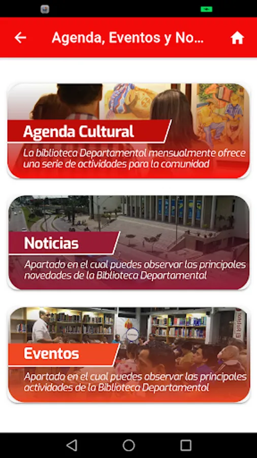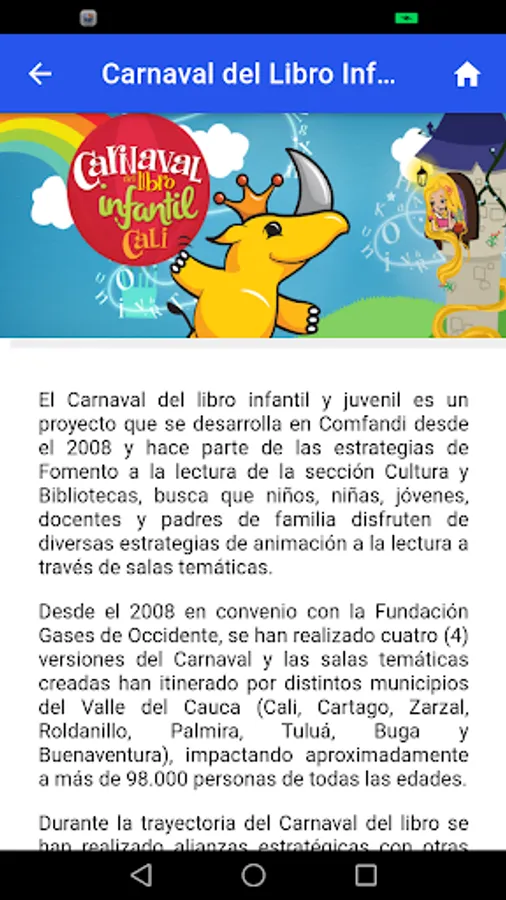 It is an application to show information of cultural institutions of the city of Cali and the Cauca Valley such as the Cali Public Library Network, the Jorge Garcés Borrero Departmental Library and the Nelson Garcés Vernaza Comfandi Cultural Center